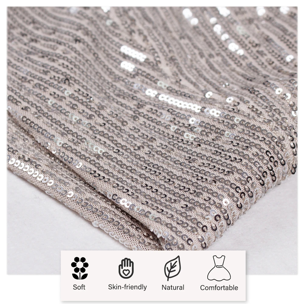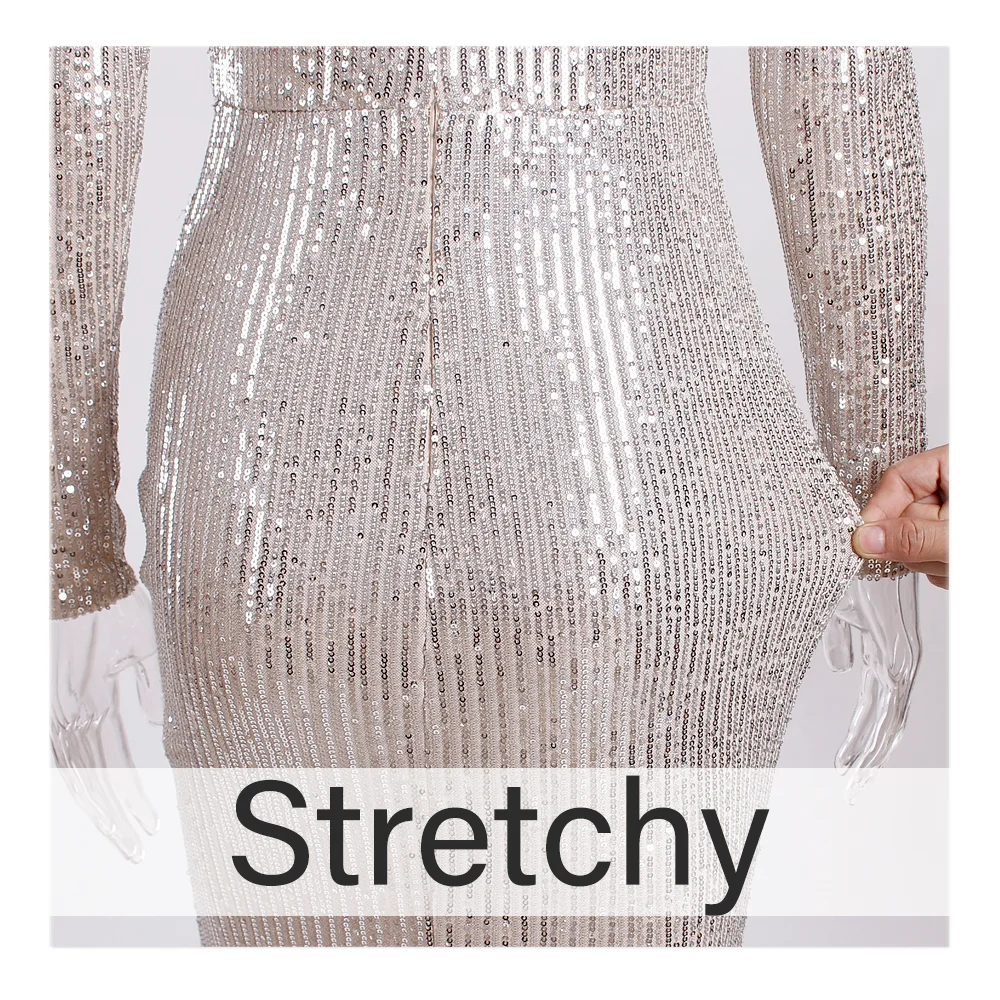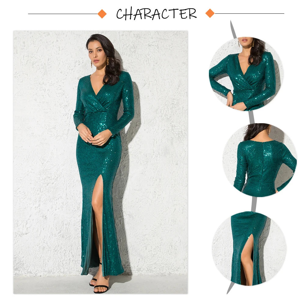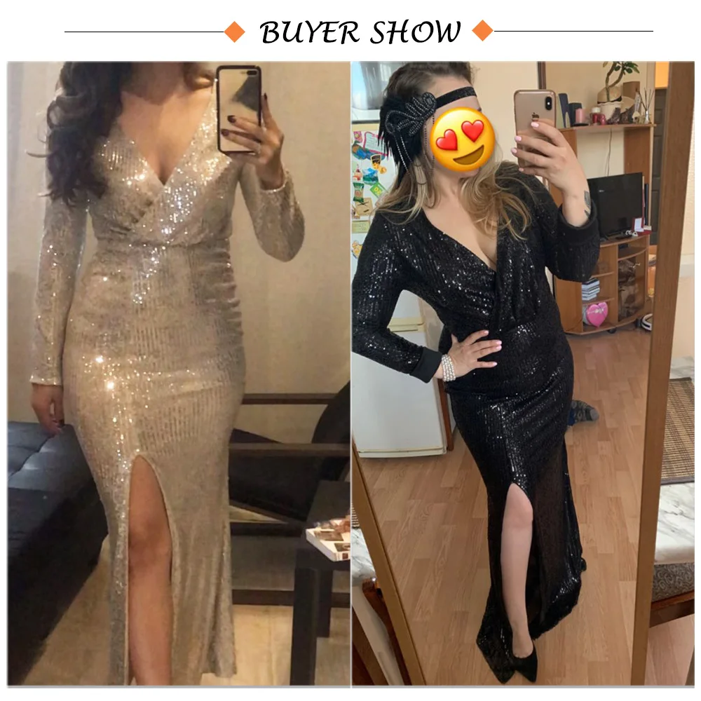 Серебристое платье-макси с длинными рукавами, V-образным вырезом, блестками и разрезом на ногах