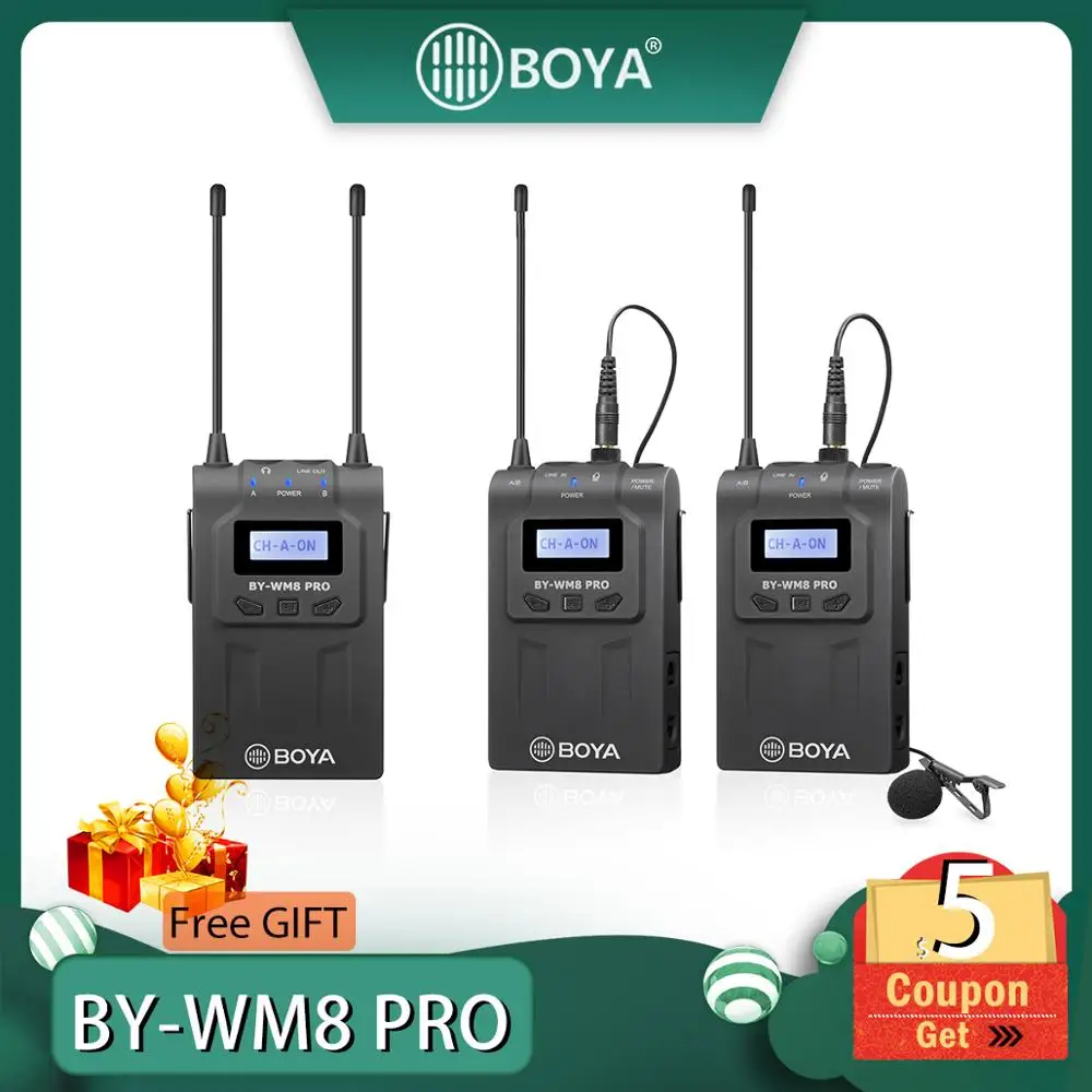 He BOYA BY-WM8 Pro-K2-Обновленная двухканальная Беспроводная микрофонная система UHFДля захвата аудио с двумя предметами, оснащен простым в считывании ЖК-дисплеем, широким переключением полосы пропускания RF, PLL-synthesized тюнингом и цифровой схемой.