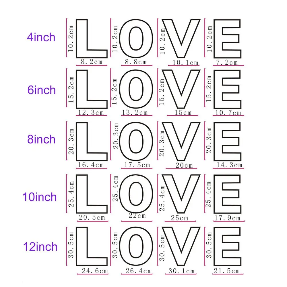Буквы высотой 25 см, но шириной все разные размеры W до больших и L до маленьких. Доставка занимает более 3 месяцев, не рекомендуется