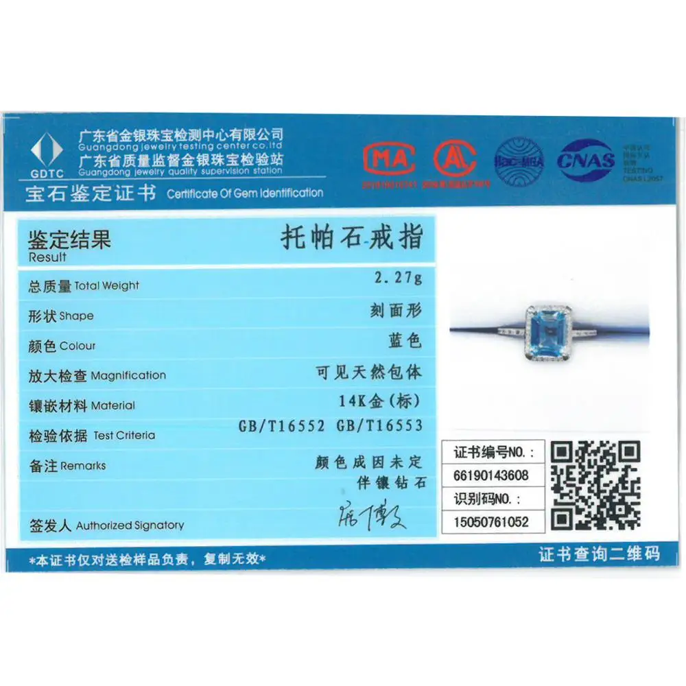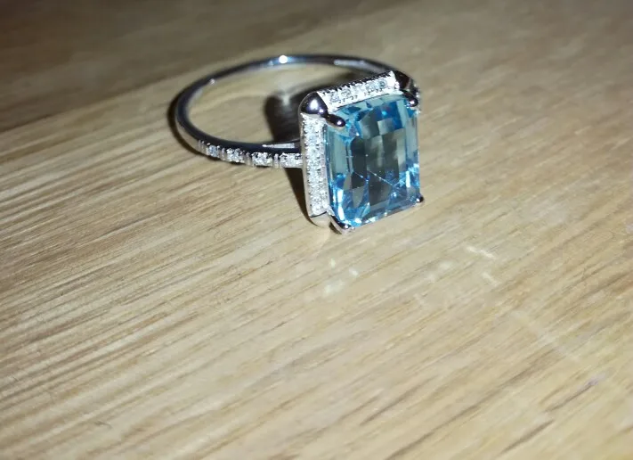 Красивая ювелирная работа из белого золота 14 К 585 пробы, основной камень нежно голубой топаз, цвет летнего неба. Размер основного камня 7х9 мм, площадка вокруг камня 10х11 мм. Размер заказала 8, он соответствует Российскому 18 размеру. Сертификат прилагается. Указанные граммы в изделии соответствуют с сертификатом. Кольцо можно носить в паре с белым золотом. Отправка была очень быстрой, в день заказа. Доставка около трёх недель. Советую к покупке. Классический стиль, модель которая всегда будет модной.