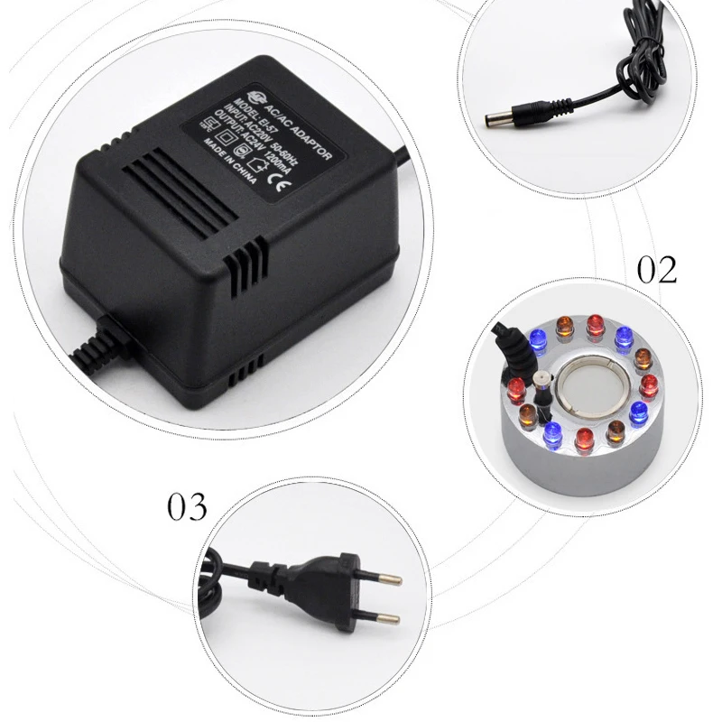 Количество СВЕТОДИОДНЫЙ: 12Длина кабеля: 120 смМощность: 19 ВтАмут распыления: 450 мл/ч Примечание:Этот продукт нельзя использовать напрямую,Он нуждается в 100V-220V трансформатор, выходное напряжение DC 24-26 В 1A.Особенности:Нет тепла или химических веществ. Принять принцип электронного колебания высоких частот.Фоггер содержит небольшое количество отрицательных ионов воздуха и может увеличить влажность воздуха, что делает воздух более свежим!С 12 светодиодный цветной светильник. Простота в эксплуатации, длительный срок службы, Самозащита Применение:Идеально подходит для внутренних или наружных фонтанов, водных объектов и офиса.Добавьте потрясающий эффект тумана в ваш пруд или резервуар для воды, чтобы фильтровать плохой запах с помощью электро-и ультразвуковой технологии. Внимание:1. Не Переворачивайте распылитель, когда переключатель включен, удерживайте в вертикальном положении, или он может повредить распылитель.2. Пожалуйста, убедитесь, что ежедневное время работы составляет менее 10 часов, в противном случае срок службы распылителя будет сокращен.3. Не связывайтесь с ломтиком распыления во время работы тумана.4. Обеспечьте высокое качество воды, используйте чистую водопроводную воду. (ухудшение качества воды может повлиять на срок службы)5. Пожалуйста, выключите питание перед перемещением или обслуживанием.6. Ломтик распыления является e, и срок его службы превышает 3000 часов. Если отмечено уменьшение тумана,Пожалуйста, очистите ломтик распыления ватным тампоном (не нужно использовать моющее средство). Держите его в чистоте.Если после очистки все еще присутствует заметное уменьшение тумана, измените новый ломтик распыления.7. Этот товар имеет функцию самозащиты. Когда уровень воды ниже датчика,Он автоматически остановит распыление. (свет включен.)8. Чтобы продлить срок службы, предлагается своевременное снабжение водой. Посылка включает в себя:1 x тумана Fogger1 х адаптер питания (опционально)