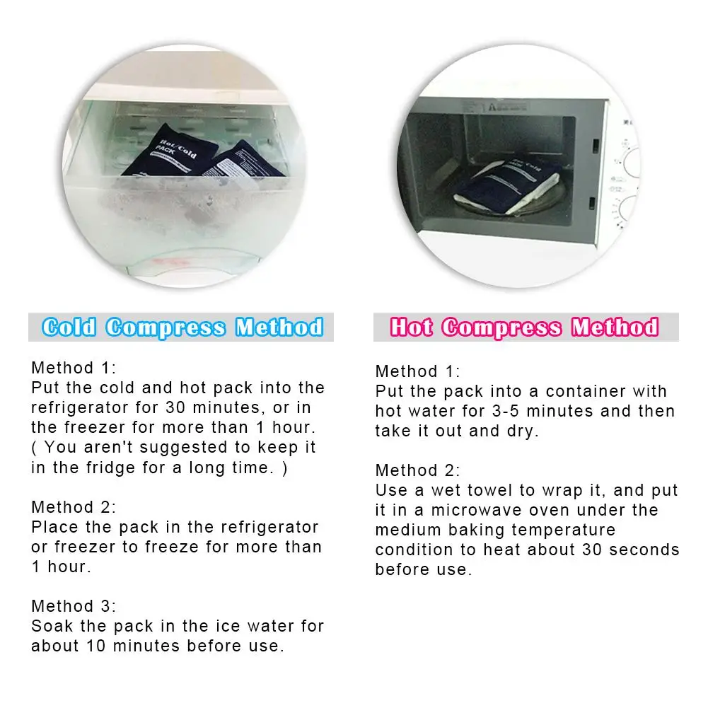 1) холодный компресс: Храните пакет в холодильнике около 30 минут или в морозильной камере более 1 часа, прежде чем вынуть его.