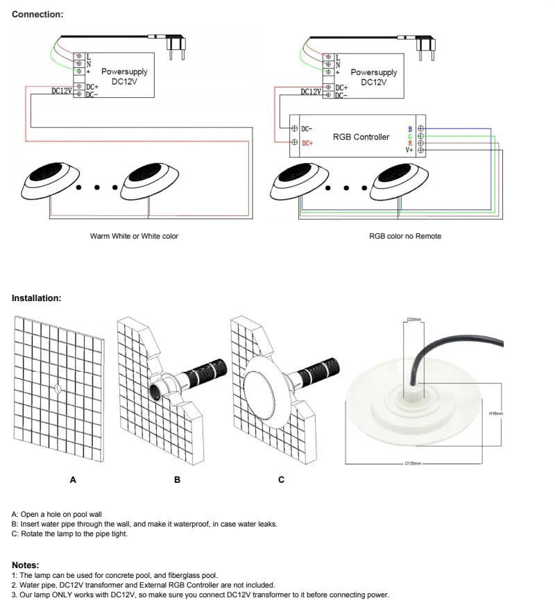 2. Водопроводная труба, трансформатор DC12V и внешний контроллер RGB в комплект не входят.