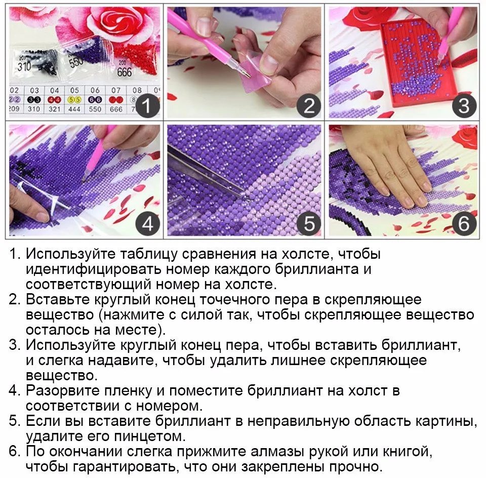 1. См. Таблицу сравнения на холсте, чтобы определить каждый номер алмаза и соответствующий номер печати на холсте. 2. Вставьте круглый конец ручки в Дозирующий цемент (нажмите, чтобы сохранить цемент на месте). 3. Используйте круглый конец ручки, чтобы приклеить бриллиант и слегка нажмите, чтобы удалить любой дополнительный цемент. 4. Разорвите частичную пленку и поместите алмаз на холст в соответствии с соответствующим номером. 5. Если вы приклеите алмаз к неправильной области на картине, удалите алмаз пинцетом. 6. После завершения слегка прижмите алмазы рукой или книгой, чтобы убедиться, что алмазы надежно закреплены.