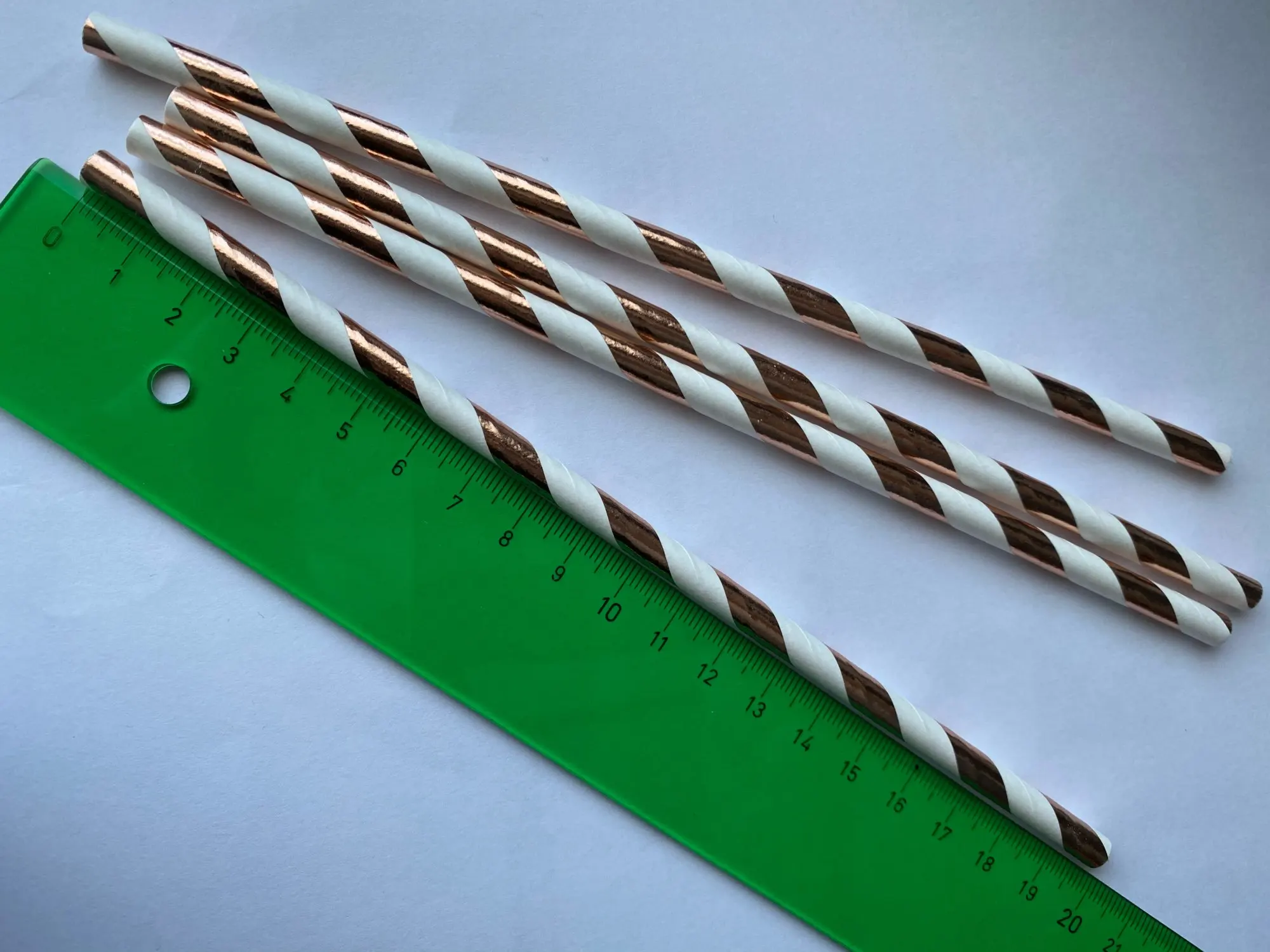 Они прибыли вовремя и в отличном состоянии. Они розового золота (как они появляются на фото) И они измеряют 19,5 см в длину и имеют 5 мм в диаметре (они несколько уже, чем пластиковые соломинки всей жизни). Они сделаны из бумаги, но они все еще твердые.