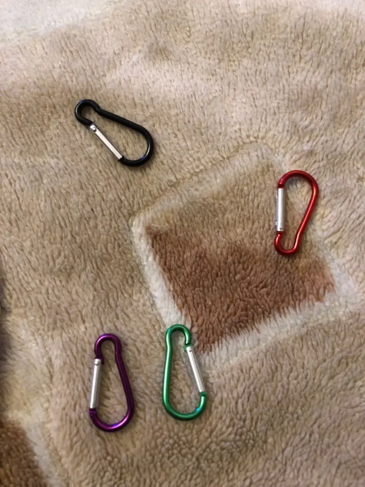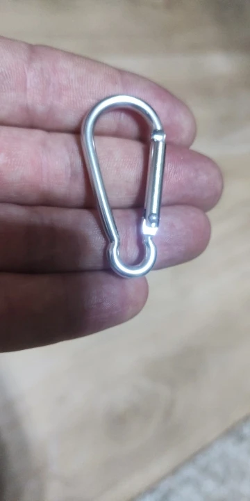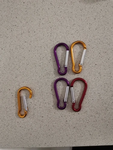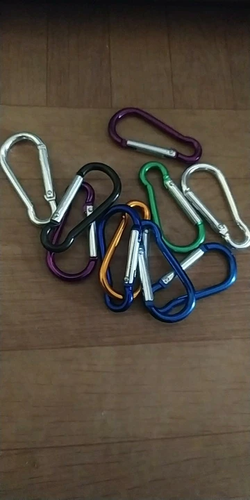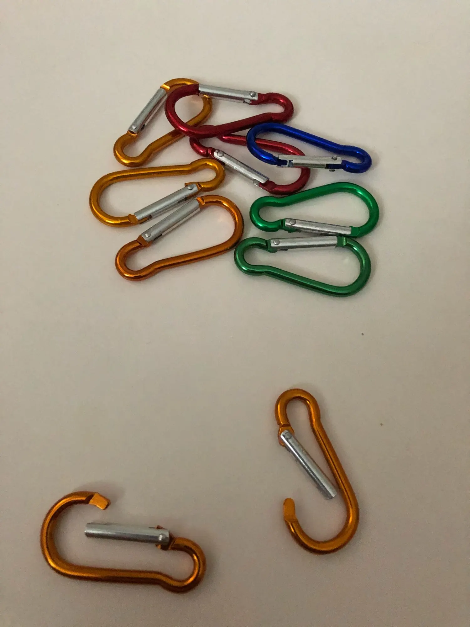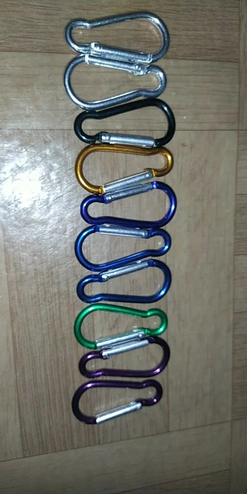 Товар пришёл в количестве 5 штук. 4 серебристых карабина и один синий. 10 штуками даже и не пахло. Размер меньше, чем на картинке. Выглядят немного хрупкими. Будем тестировать.