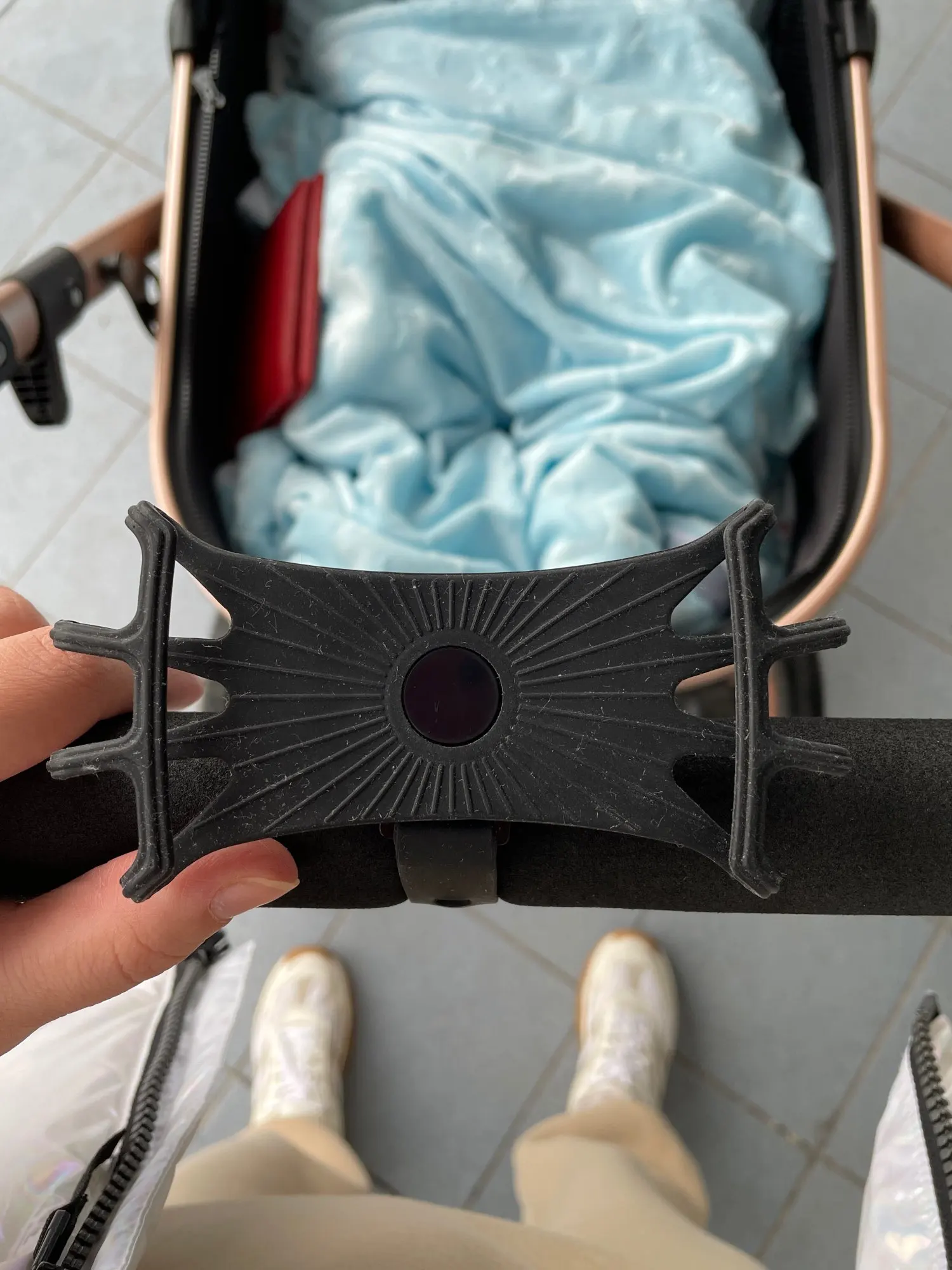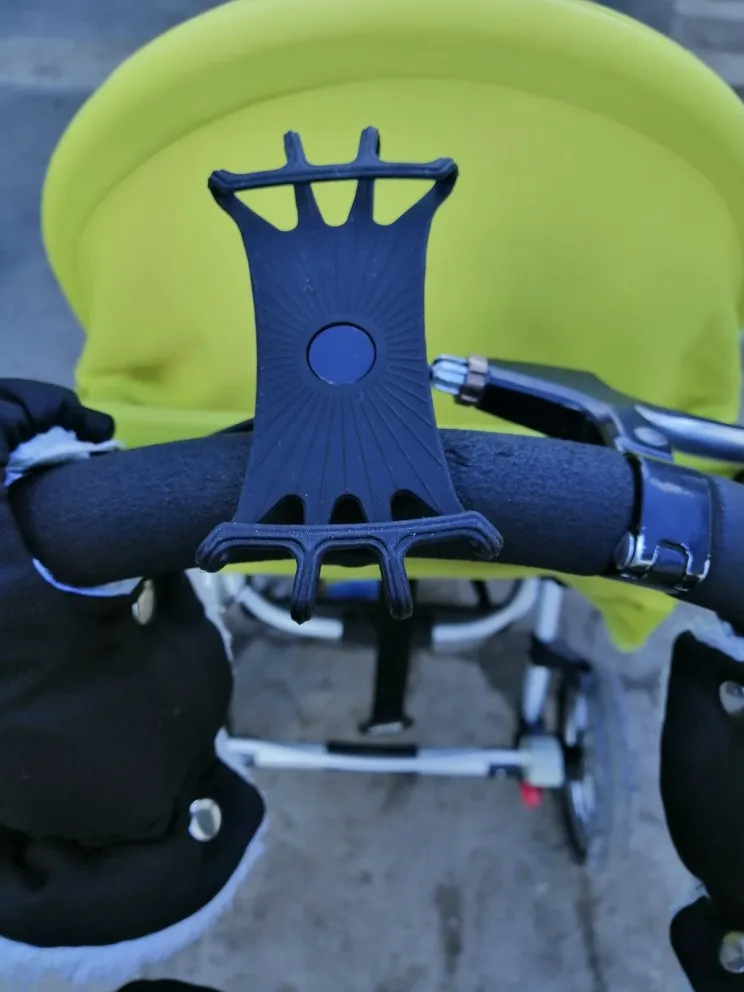 Очень удобная штука. Цепляется на ручку коляски и натягивается на любой телефон. Держится хорошо