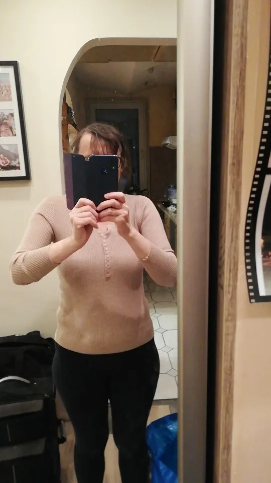 В принципе все как на фото, но кроме конечно же рукавов. На грудь 85, талию 62 село хорошо, тянется, ткань мягкая, как у водолазки, очень приятно к телу. На рост 165 рукава видите на фото, их можно натянуть сильнее, но в процессе носки они опять подвздереутся, длина самой кофты нормальная, лучше ее конечно заправлять в джинсы или юбки.Пошито вроде ровно, есть небольшой запах. Пуговицы не расстегиваются. Доставка быстрая