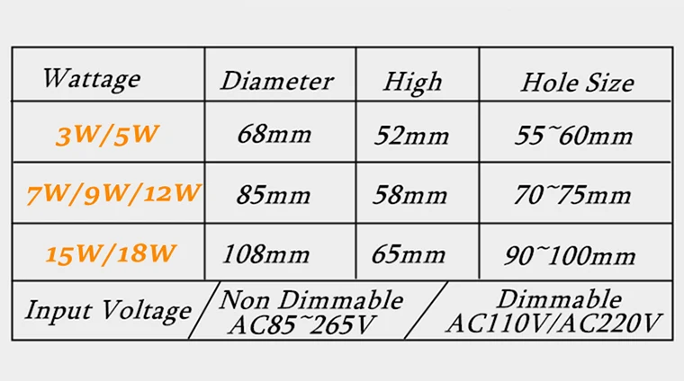 Вход Напряжение: AC85 ~ 265V/110V/220V 50/60HzМощность: 3 Вт/5 Вт/7 Вт/9 Вт/12 Вт/15 Вт/18 ВтРегулировка яркости: ДаИндекс цветопередачи (CRI):>Ra85Угол луча: 24 °Светодиодный чип: C0B чип (Epistar)Световой поток: 95 ~ 110 лм/ВтТемпература: от-25 до 45 °Цветовая температура: теплый белый:(2700K-3000K); Натуральный белый:(4000K-4200K); Холодный белый:(6000K-6500K)Срок службы: 80000 часовГарантия: 3 годаМатериал: литье алюминияПроисхождение: Гуандун (Китай)