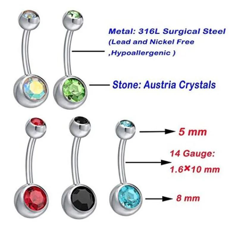Посылка: 5 шт. колец на кнопках для живота. Поставляется с бархатной подарочной сумкой Материал: изготовлен из хирургической нержавеющей стали, прочный и гипоаллергенный, полностью не КОРРОЗИОННЫЙ, без свинца и никеля, также устойчив к кислоте, щелочи, не выцветает, не искажает Толщина: 14 г (1,6 мм); Длина стержня: 10 м (3/8 дюйма); Размер верхнего шара: 5 мм, размер дна: 8 мм Тип пирсинга: идеальный размер для кольца живота, пирсинга пупка и т. Д. Гарантия: 90 дней обмен или гарантия возврата денег