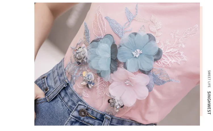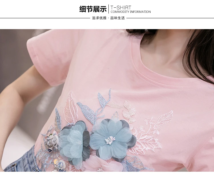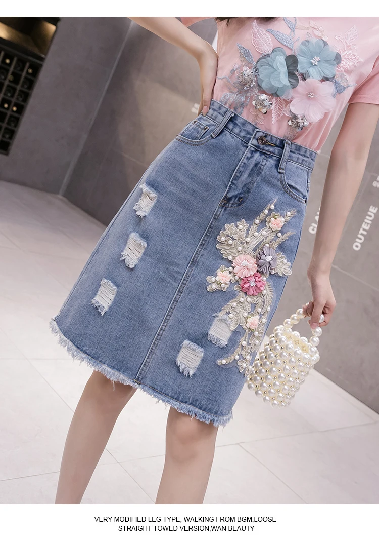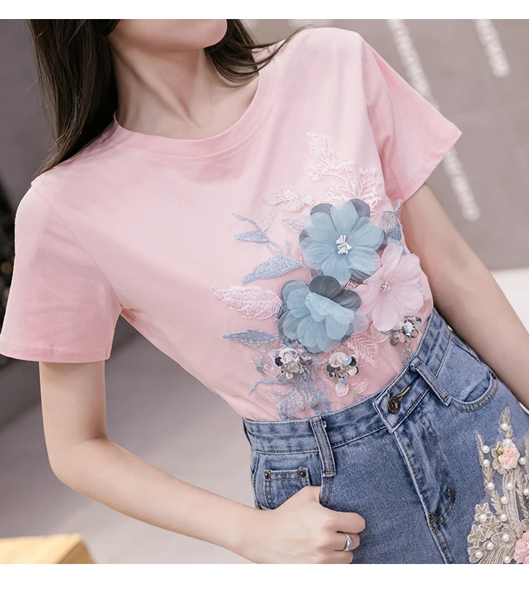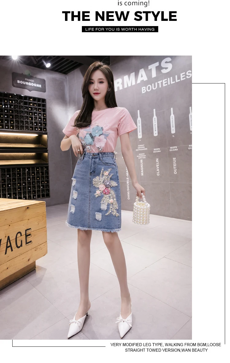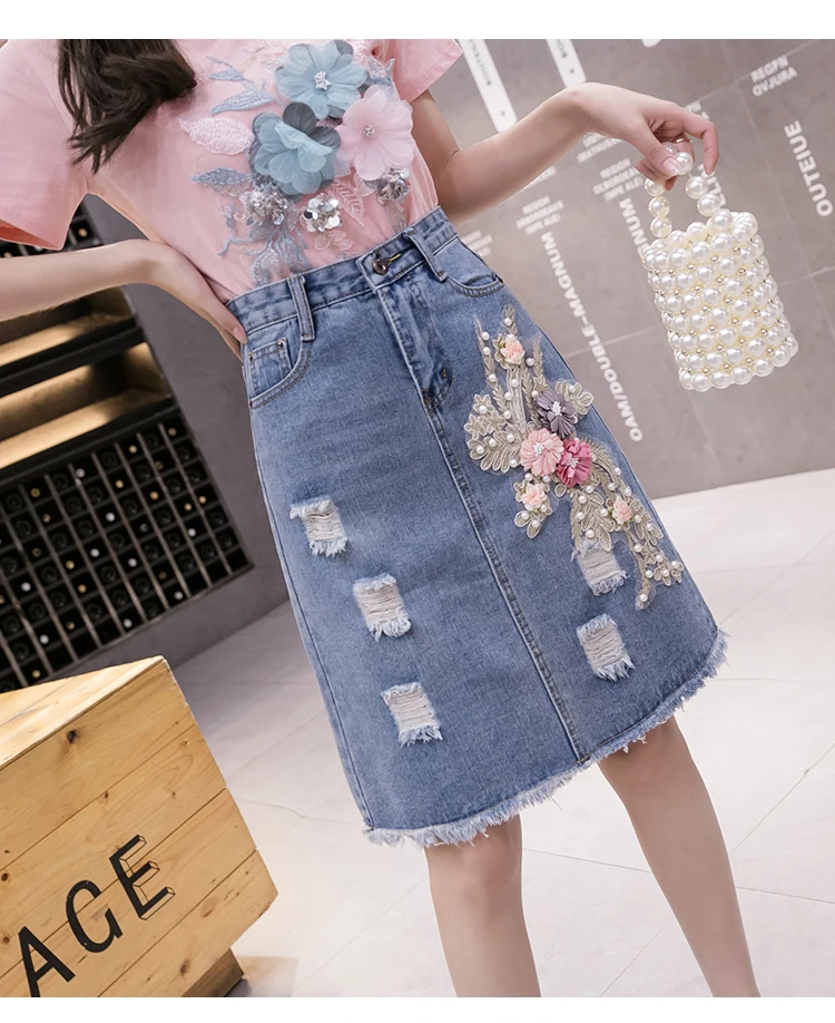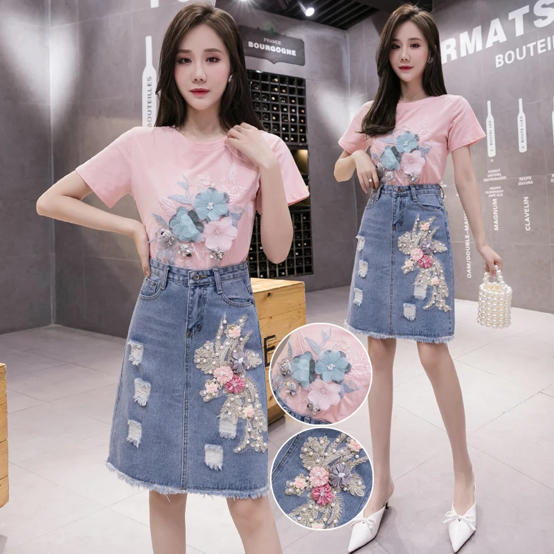 Летний комплект для девочек из бисера с вышитыми цветами; Хлопковая футболка с короткими рукавами и джинсовая юбка комплект из двух предметов женские футболки костюм с джинсовой юбкой, комплекты одежды