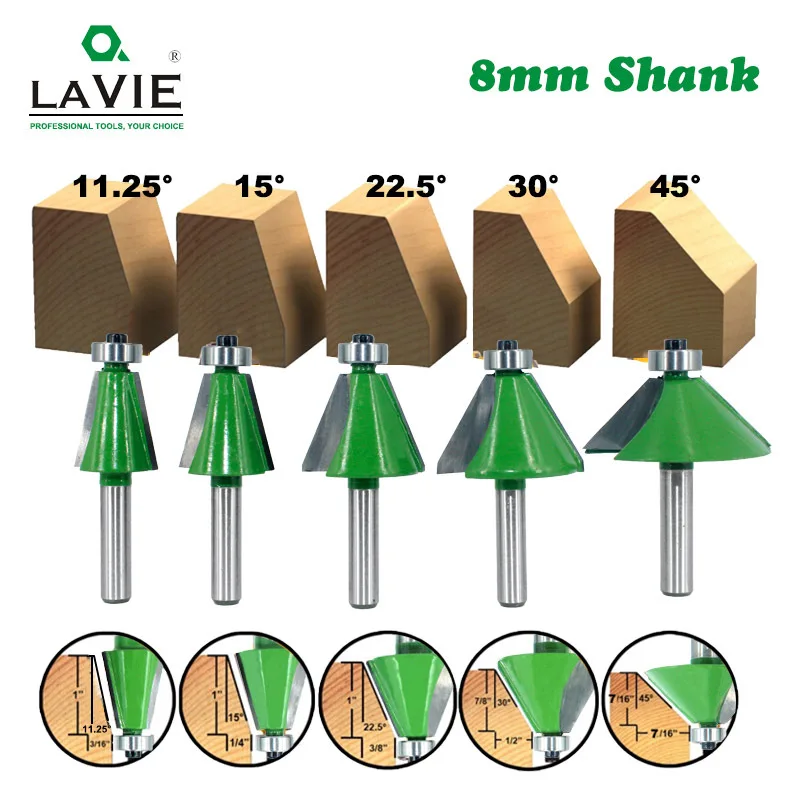 Фреза фаска с хвостовиком 8 мм, 5 шт., фреза 11,25 15 22,5 30 45 градусов для деревообработки