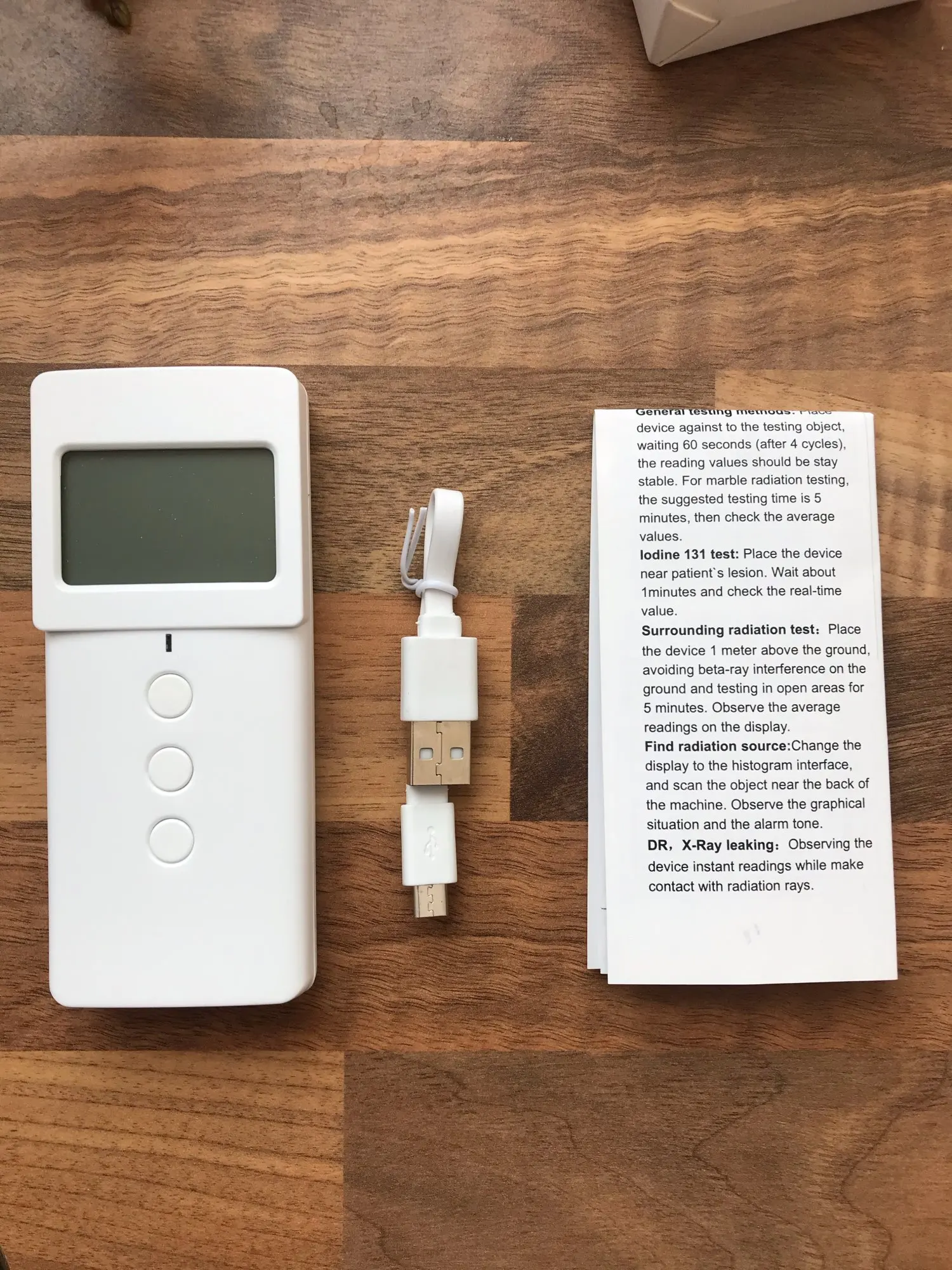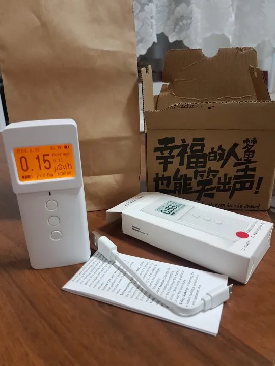 Товар заказан 6.09.20, курьер привез 15.09.20. Уракован хорошо. В комплекте кабель usb. После зарядки аппарат включился нормально. Инструкция на китайском, но в ютюбе нашел обзор. Сразу проверил всю квартиру. Уровень радиации в норме.