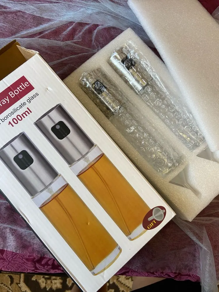 Мгновенная доставка курьером. Картонная упаковка была помята, содержание коробки - все целое. Разбрызгивает воду «в пыль», оливковое масло брызгает струйкой. Не вижу проблемы воспользоваться резиновой кисточкой и распределить масло по сковороде. Когда масла остаётся меньше, чем половина бутылочки, при наклоне в трубку попадает воздух, приходится делать несколько «холостых» нажатий, либо контролировать этот момент и подливать масло чаще :)