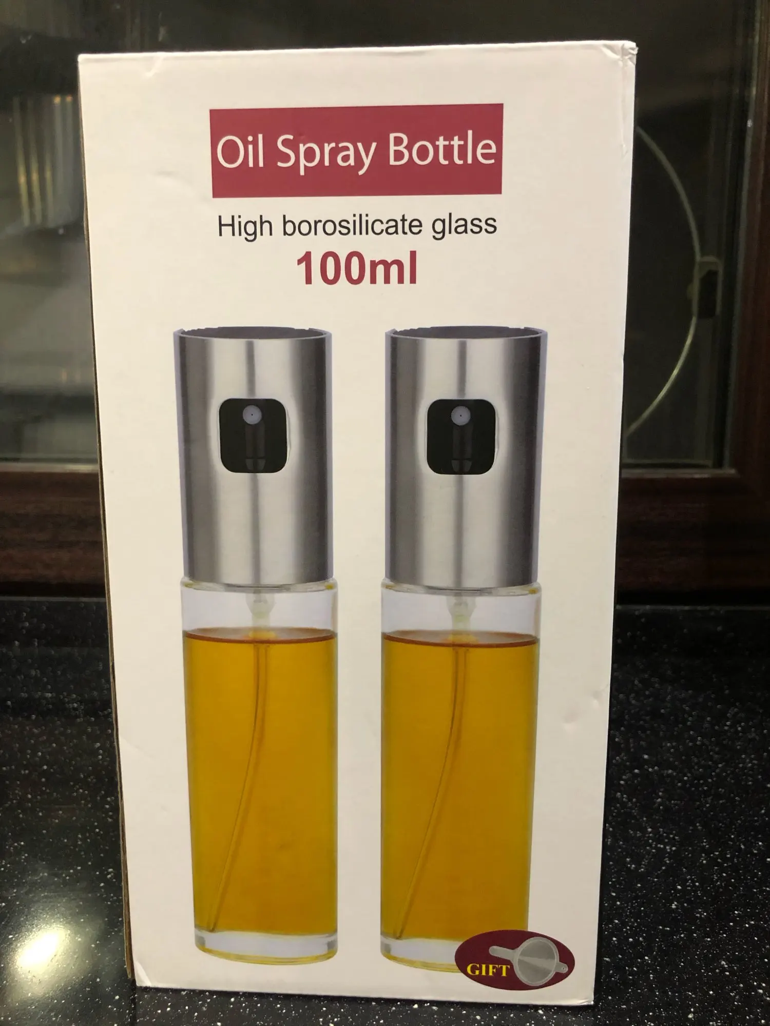 Товар качественный. Упакован хорошо, ничего не разбилось, коробка в отличном состоянии. Пришёл со склада Польши в Германию быстро. Внимание! Оливковое масло выходит струёй, с подсолнечным - такая же история. Это и понятно, масло очень плотное и для его распыления необходимо совсем другое приспособление. А вот с соевым соусом, уксусом и жидкими смесями для заправок салатов этот распылитель справляется отлично. Почему-то производитель преподносит данный товар как распылитель для масла. Но масло он не распыляет, а учитывая конструкцию - не должен. На фото тёмная жидкость - смесь соевого соуса и оливкового масла (распыляется на салфетку облаком, очень мелко), во второй баночке - оливковое масло (на салфетке итог разбрызгивания - масляное пятно).