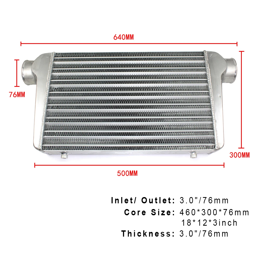 Общий размер интеркулера: 640 мм (Д) X 300 мм (В) X 76 мм (Ш) Размер сердечника: 460 мм (Д) X 300 мм (В) X 76 мм (Ш) Вход/выход: 3,0 дюйма/76 мм Настоятельно рекомендуется Профессиональный установщик (Инструкция в комплект не входит).