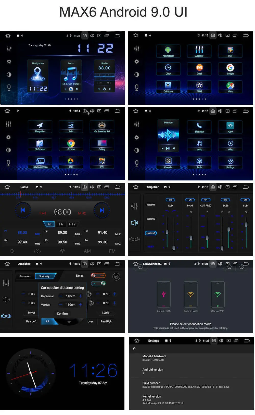 1)Android 9,0, RAM:4 Гб, ROM:64 ГБ,ЦП: PX6RK3399Процессор, с HDMI видеоВыход