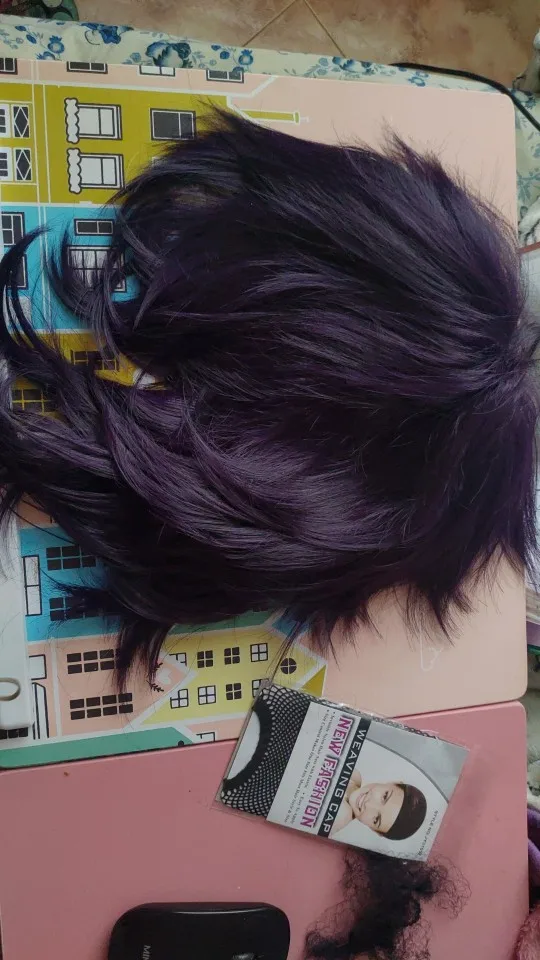 Парик из коротких фиолетовых и черных волос для косплея, с шапочкой