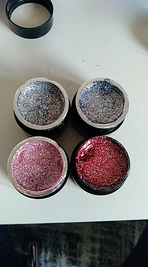 Баночки получила через семь недель после заказа. Все целое, цвет соответствует, блёстки и мелкие и крупные, мерцают ярко,укрывисто покрывают поверхность ногтя.