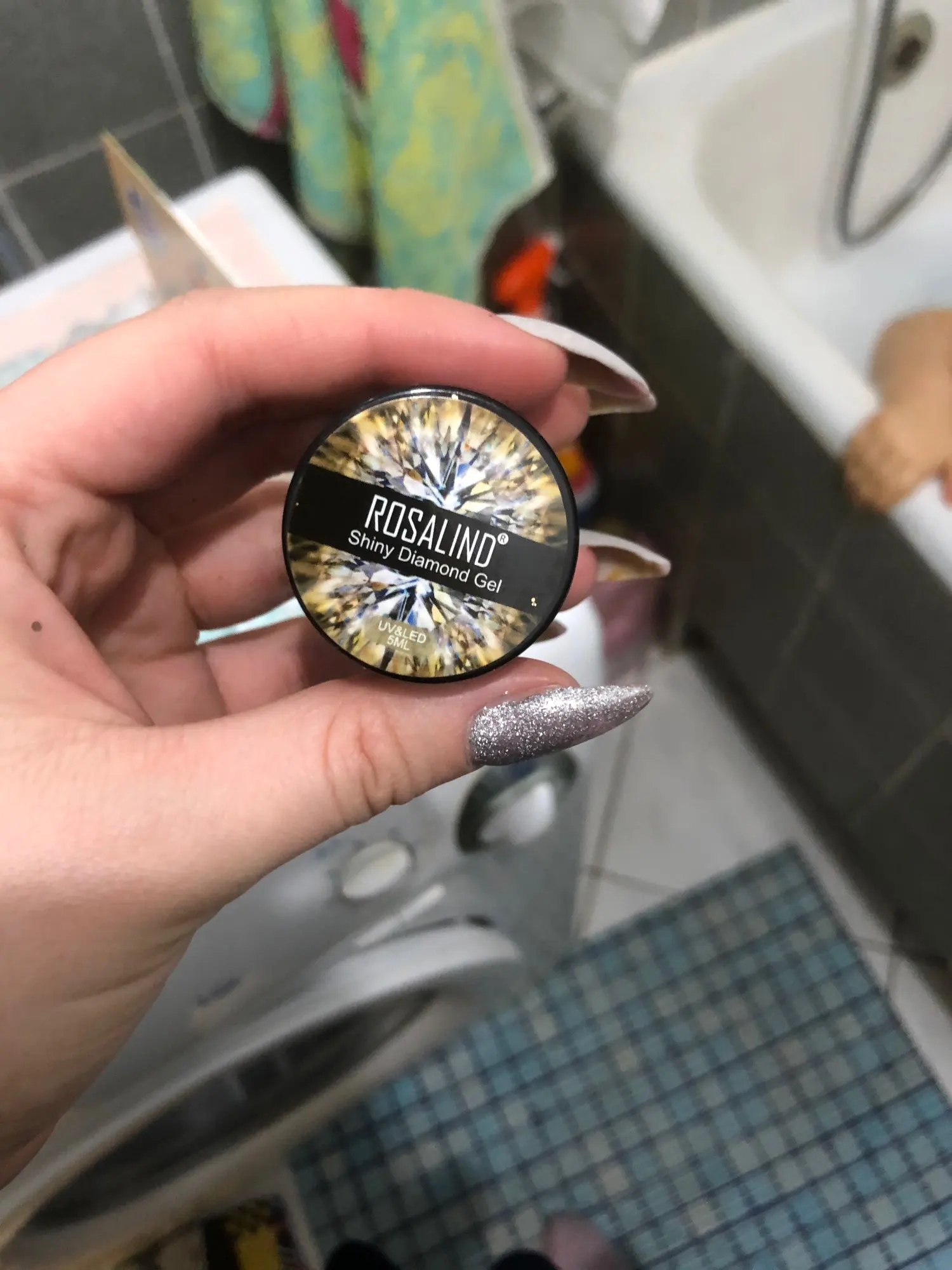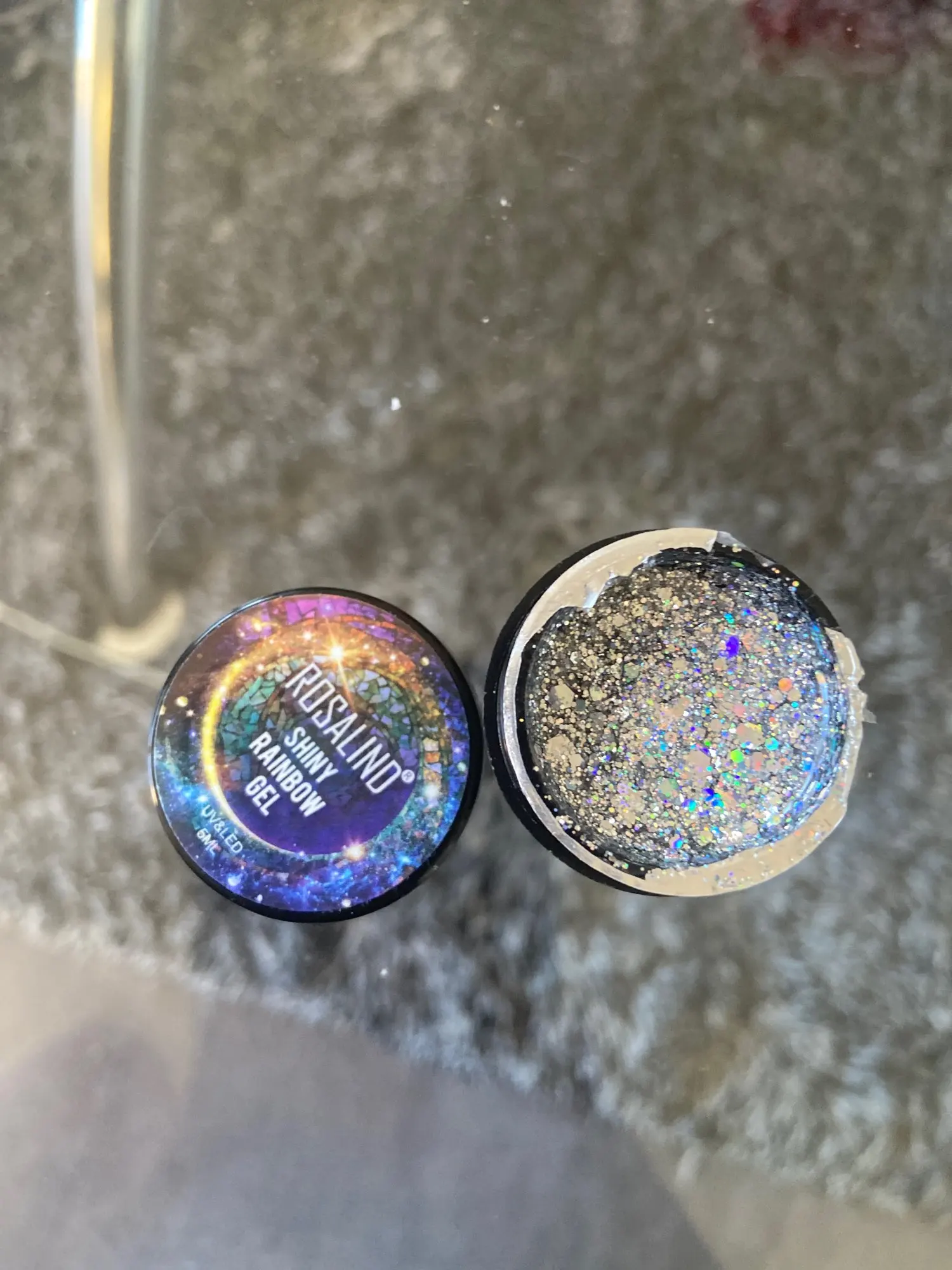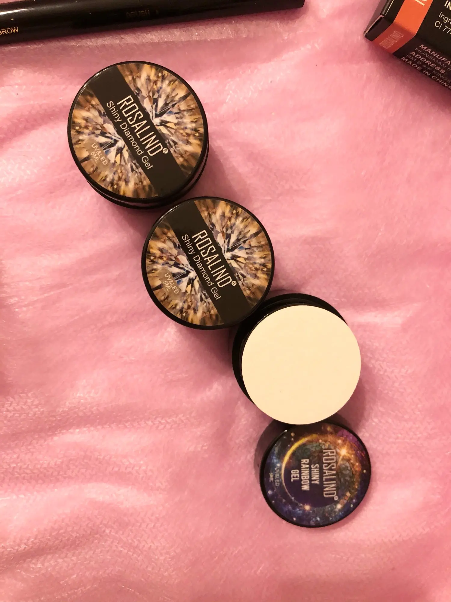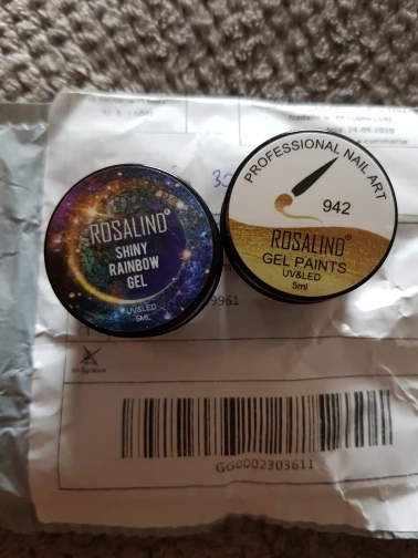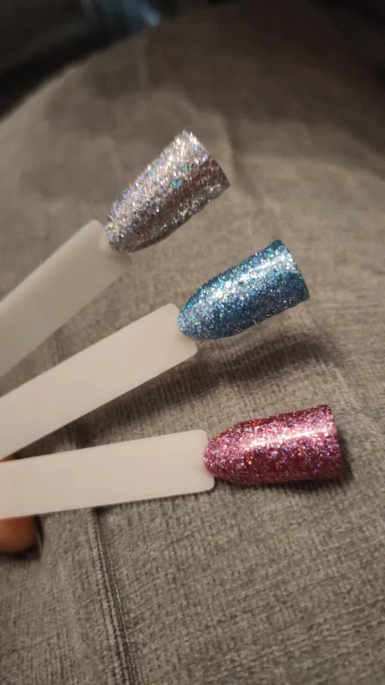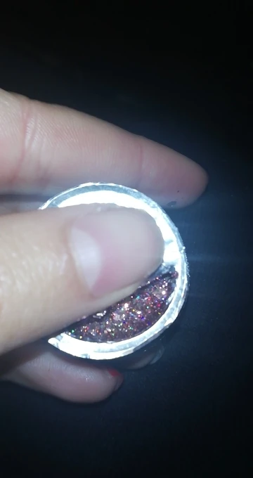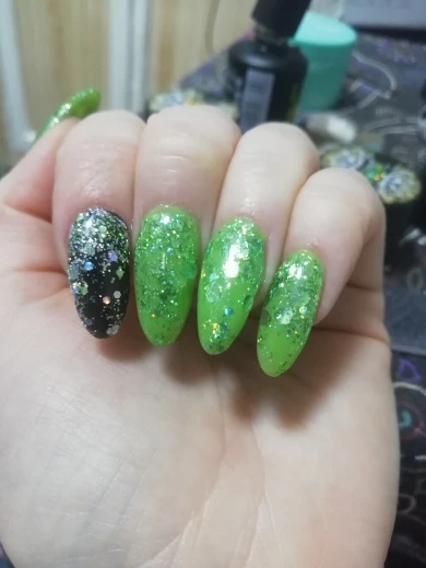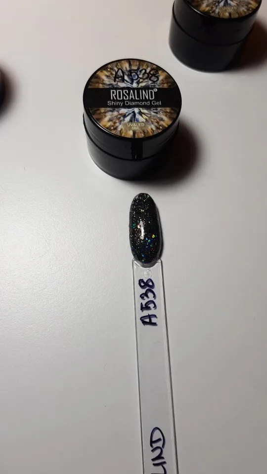 Приехал гель уже вскрытым. Немного протек, не критично, но всё равно, могло быть и лучше. Блёстки крупные и мелкие в перемешку. Пока ещё не лпробовала его на клиентах.
