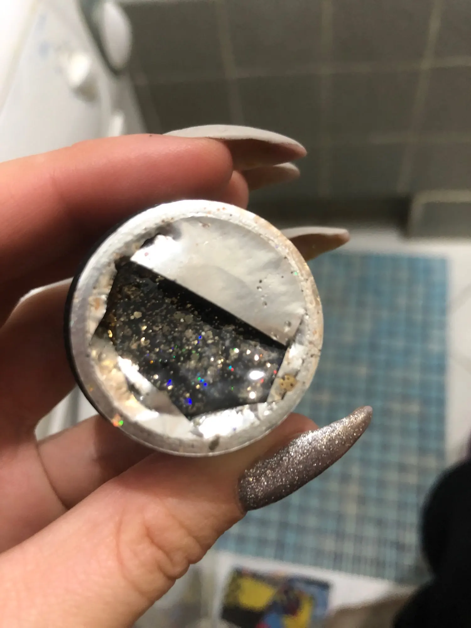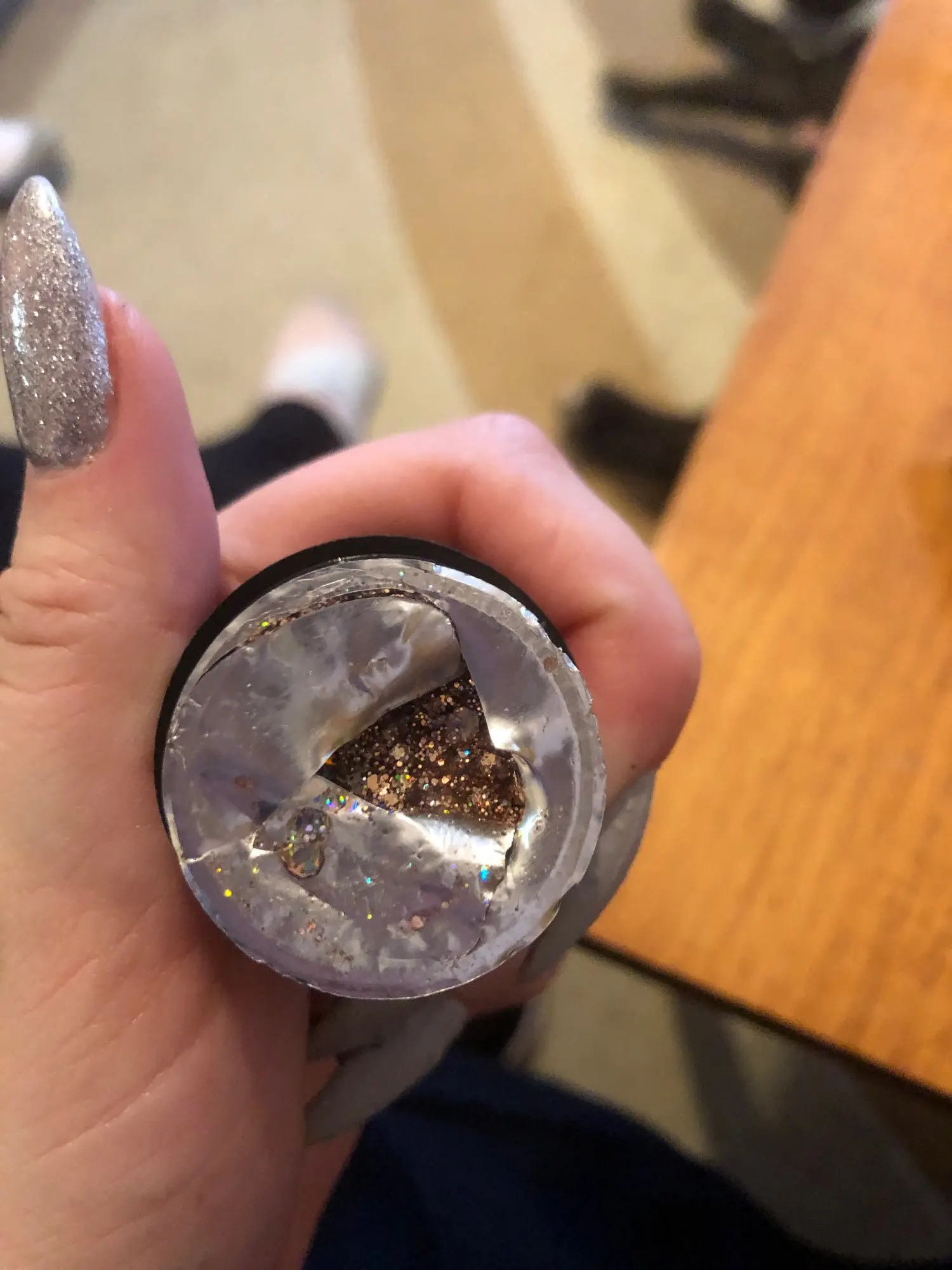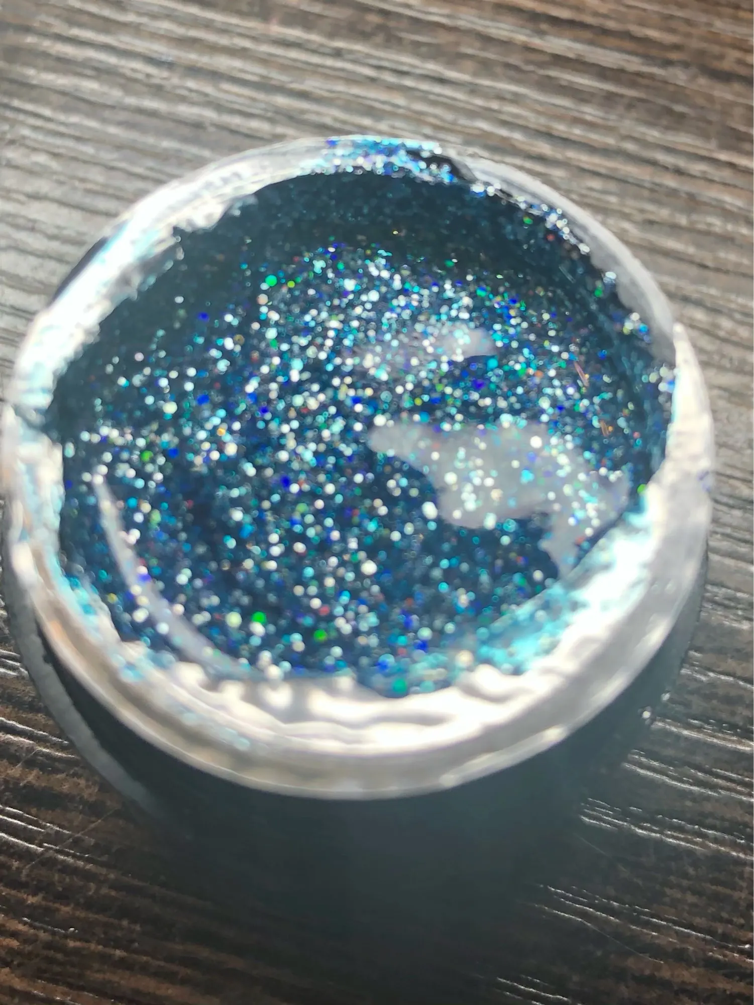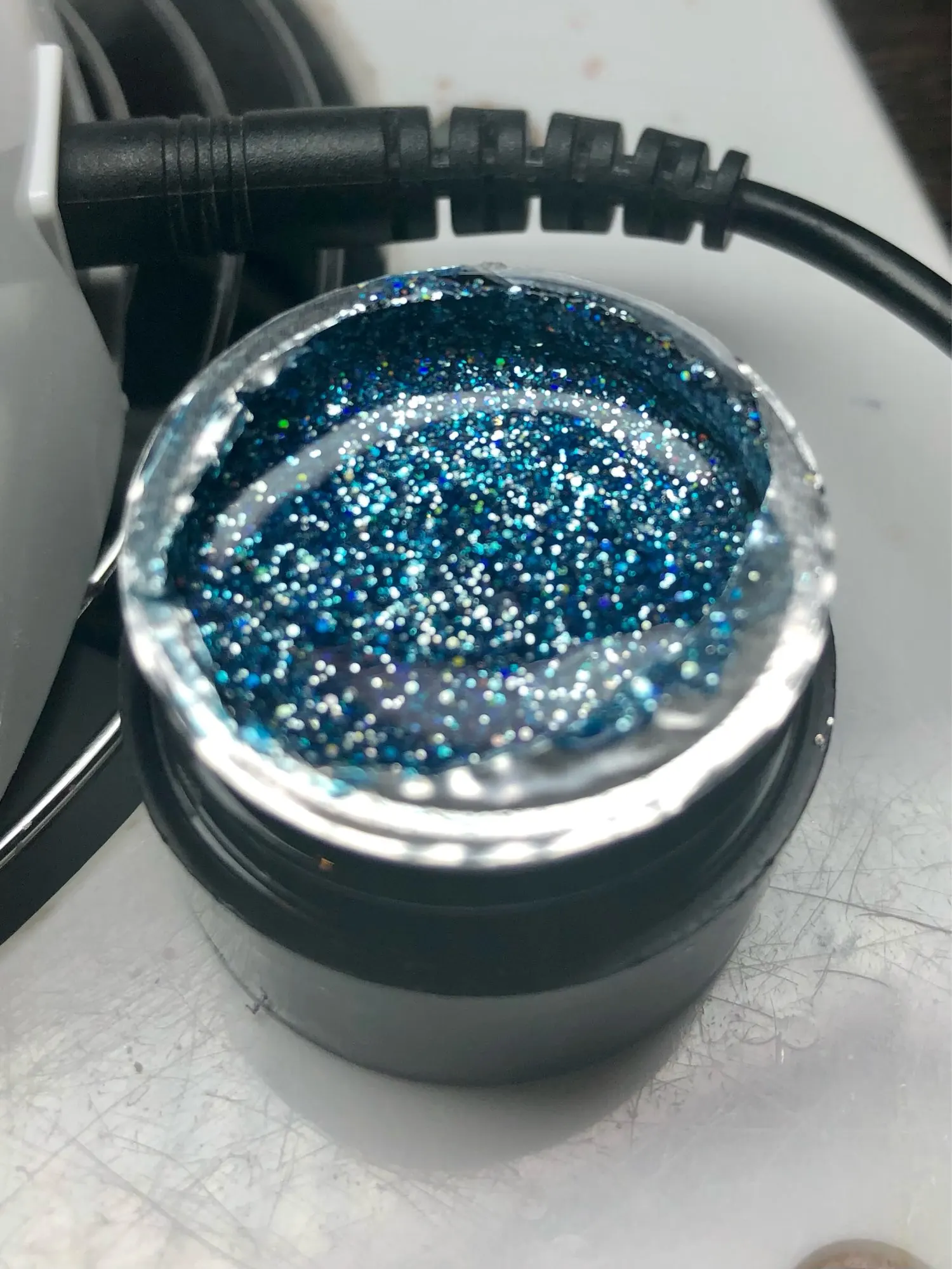 Приехал гель уже вскрытым. Немного протек, не критично, но всё равно, могло быть и лучше. Блёстки крупные и мелкие в перемешку. Пока ещё не лпробовала его на клиентах.