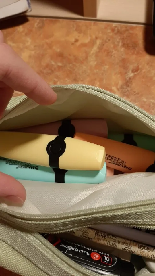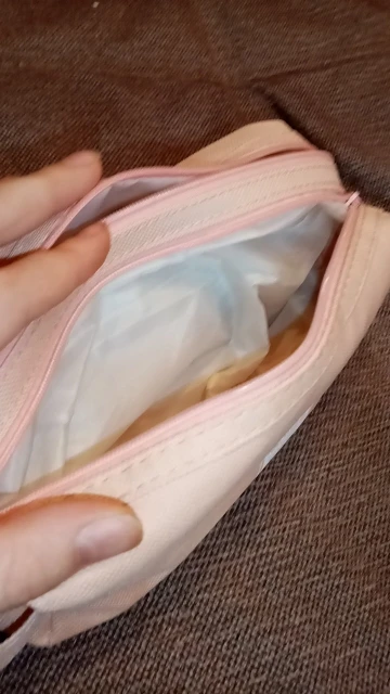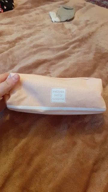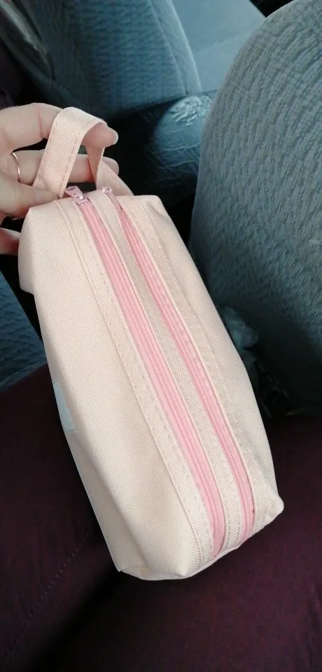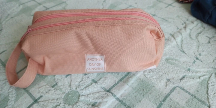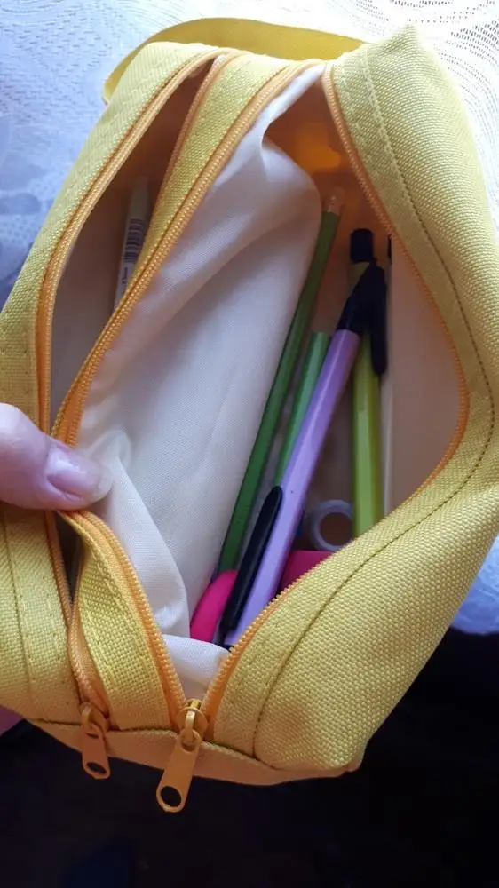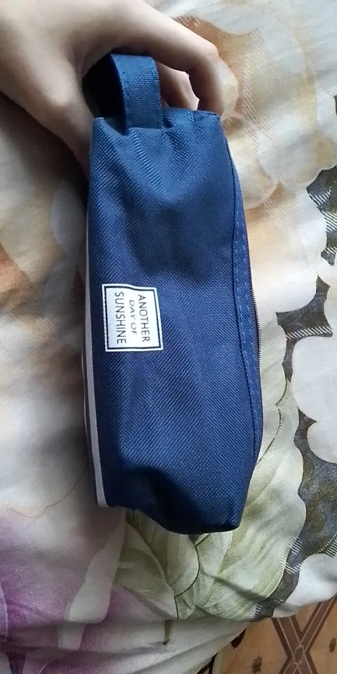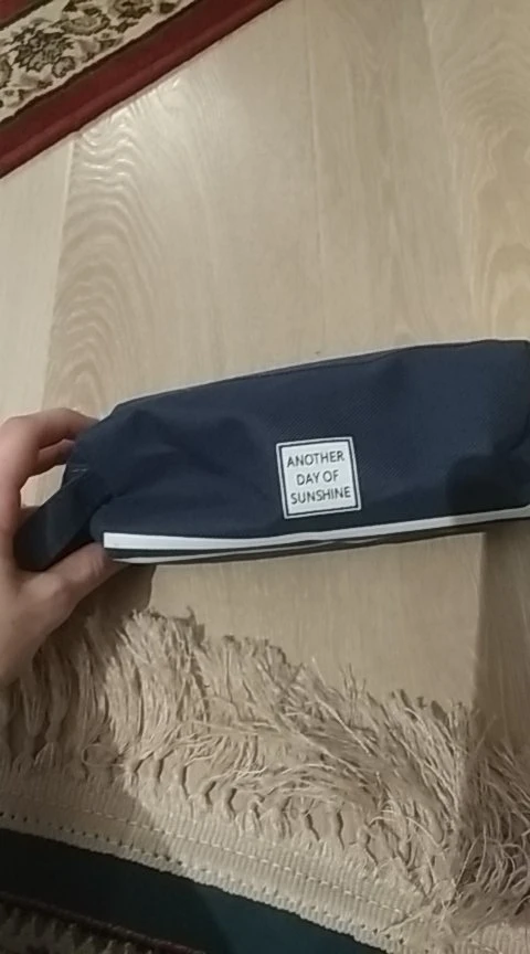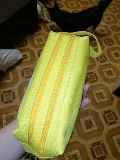 Большой и вместительный(можно хоть всю свою канцеляю сложить), нравится, что с ручкой, удобно, и два отдела. Внутри подложка немного шуршит. Но одна молния заедает. В целом мне нравится