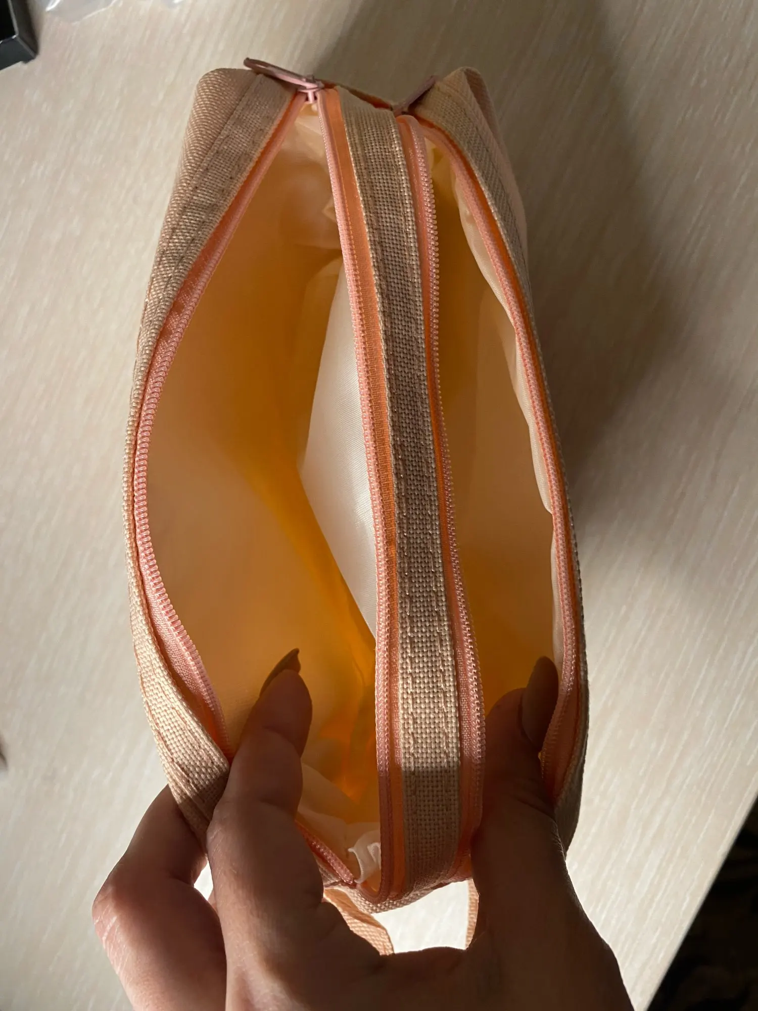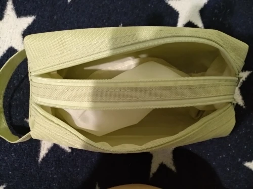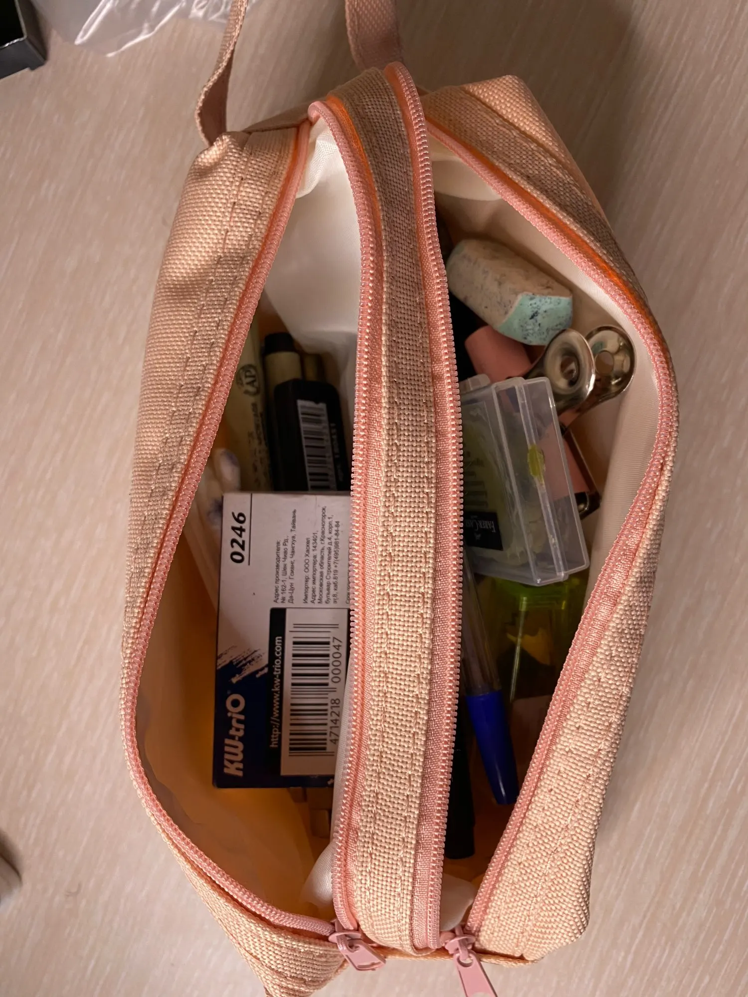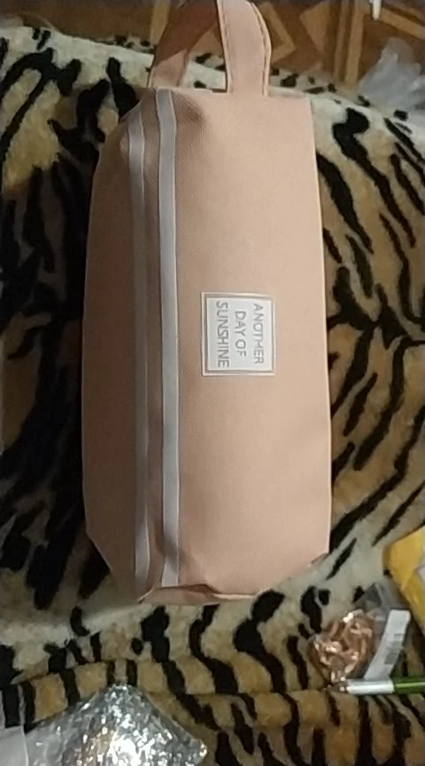Большой и вместительный(можно хоть всю свою канцеляю сложить), нравится, что с ручкой, удобно, и два отдела. Внутри подложка немного шуршит. Но одна молния заедает. В целом мне нравится