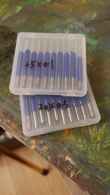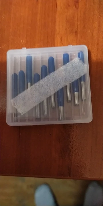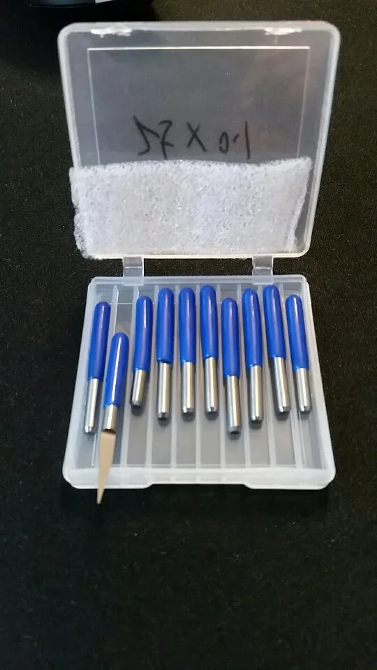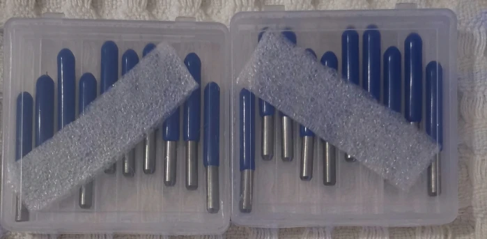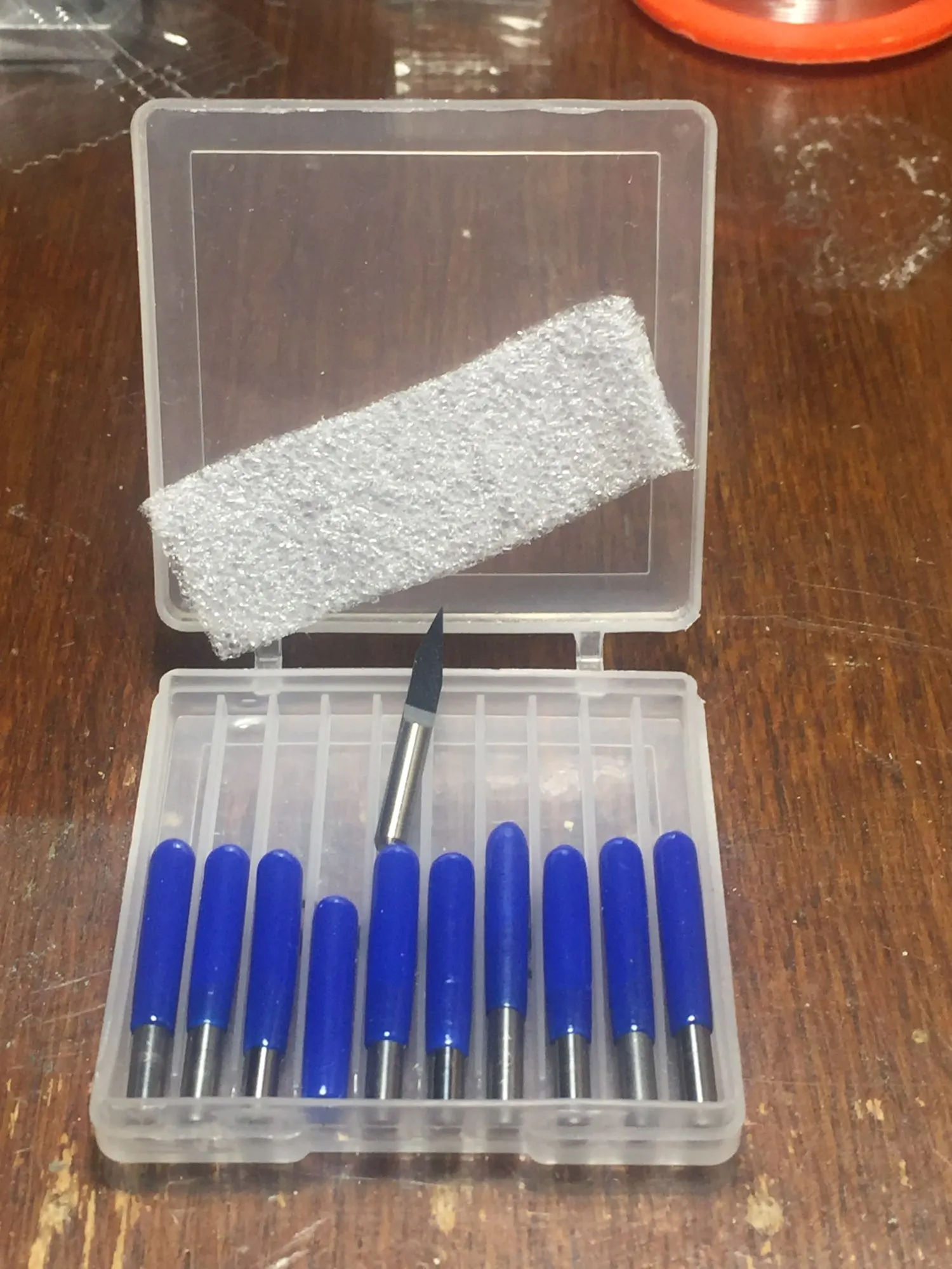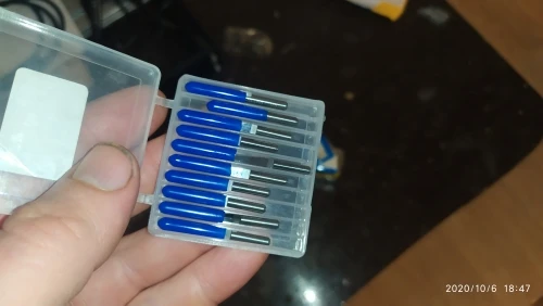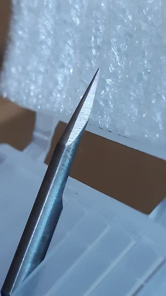 Хорошие штихели. Острые, не сильно хрупкие, по алюминию, нержавейке 314ой и по текстолиту елозят отлично. Заусенцев и подрывов почти нет, если правильно подобраны обороты и подача. Хорошо гравируют начиная с 5000 оборотов в минуту. Упаковка - пластиковый кейс + прижимная лента из вспененного материала.