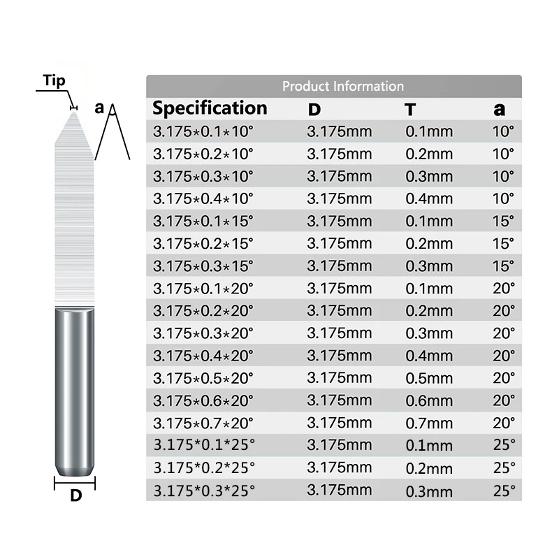 хорошие фрезы, беру второй раз. оба раза брал 15градусов на 0.1 мм. но по факту получить эти 0.1мм нельзя - в процессе приработки обламывается кончик даже на очень щадящих подачах. в результате фактическая ширина реза при глубине в 0.2мм выходит около 0.7мм. меня такой рез устраивает резал древесину, оргстекло и алюминий, везде справляется хорошо после сильной поломки кончика (облом на несколько мм, не перетачивать же их при цене в 25 рублей в самом деле) просто заряжаю в ручной гравер. в нём они вполне уверенно грызут 3мм стали, хоть и с порчей режущих кромок, но даже с таком виде их хватает надолго