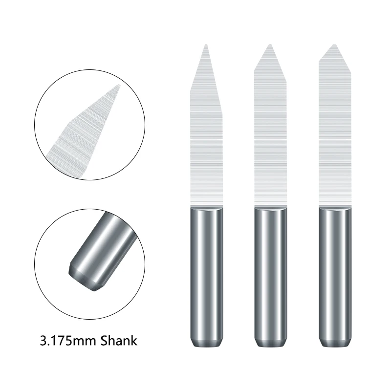 Резцы для гравировки отлично подходят для пластика. При фрезере в дюралюминином необходимо увеличить скорость (1000-3000/мин), использовать очень маленький корм (5 мм/сек.) И небольшая глубина фрезерования (0,2-0,3 мм). Более глубокие канавки должны проходить несколько раз. Для фрезерования в стали угол кончика 20 ° слишком острый