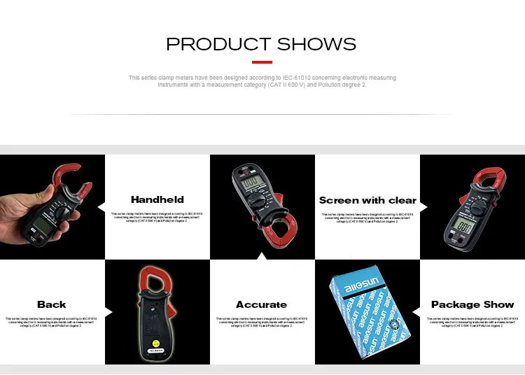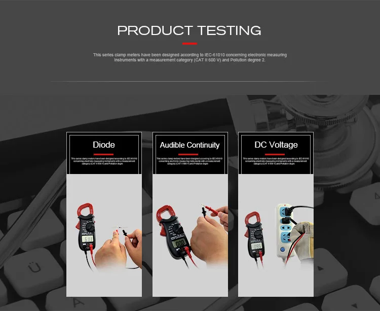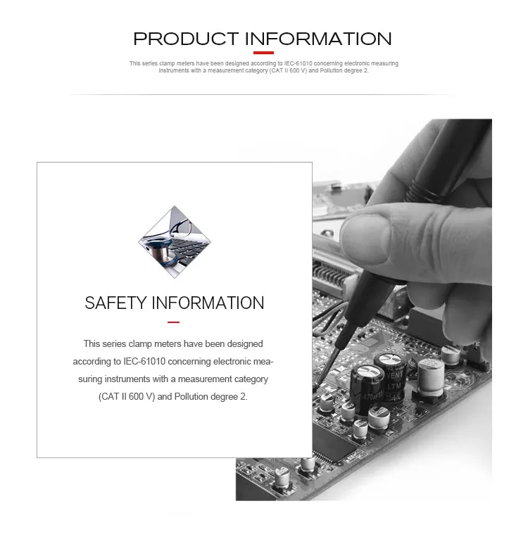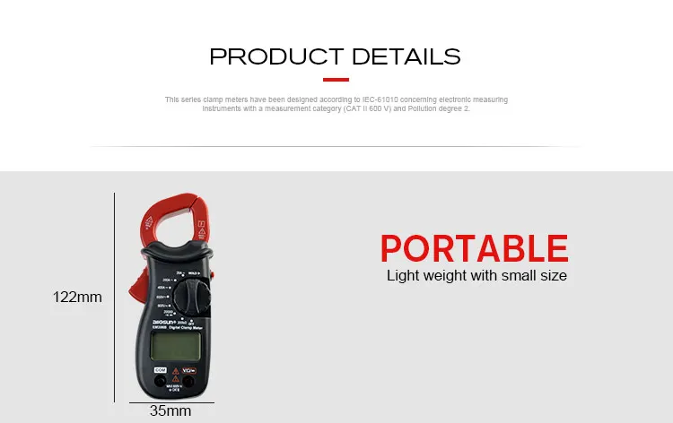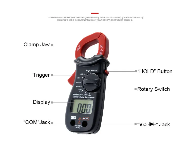 1) 3 1/2-разрядный ЖК-дисплей, с макс. считыванием 19992) Автоматическая индикация полярности3) Диаметр зонда: Макс. 25 мм4) IEC-61010 CAT II 600V5) индикация низкого заряда батареи6) защита от перегрузки7) режим удержания данных