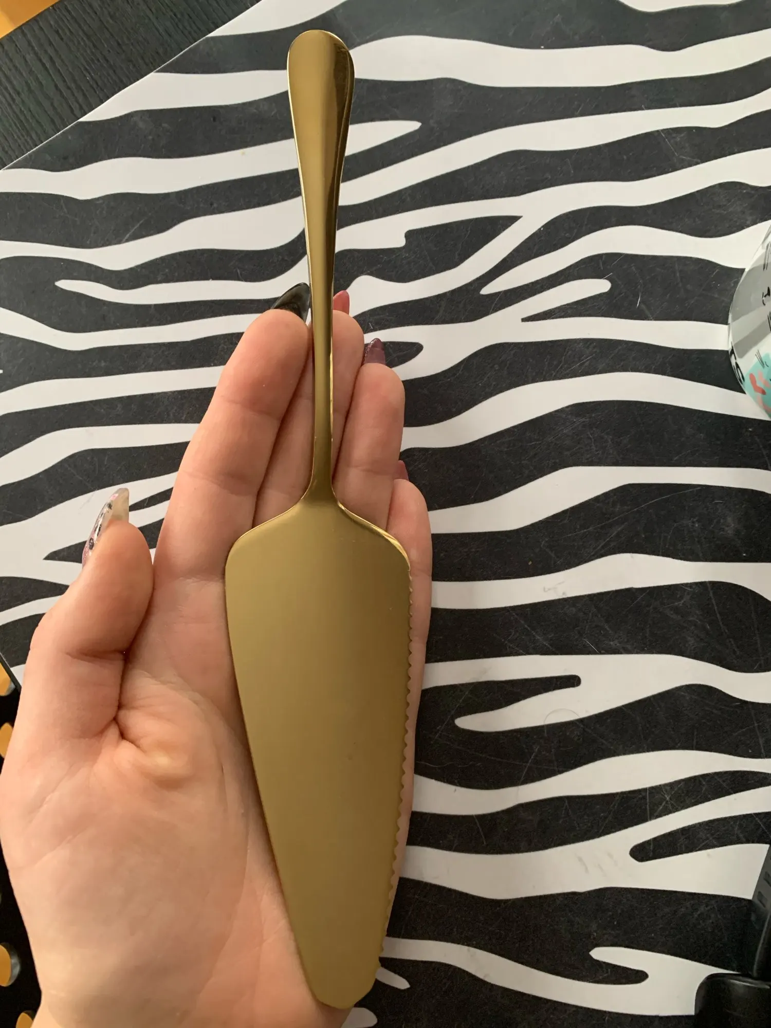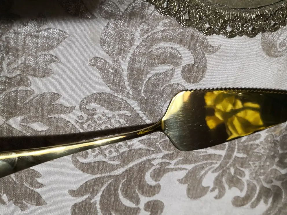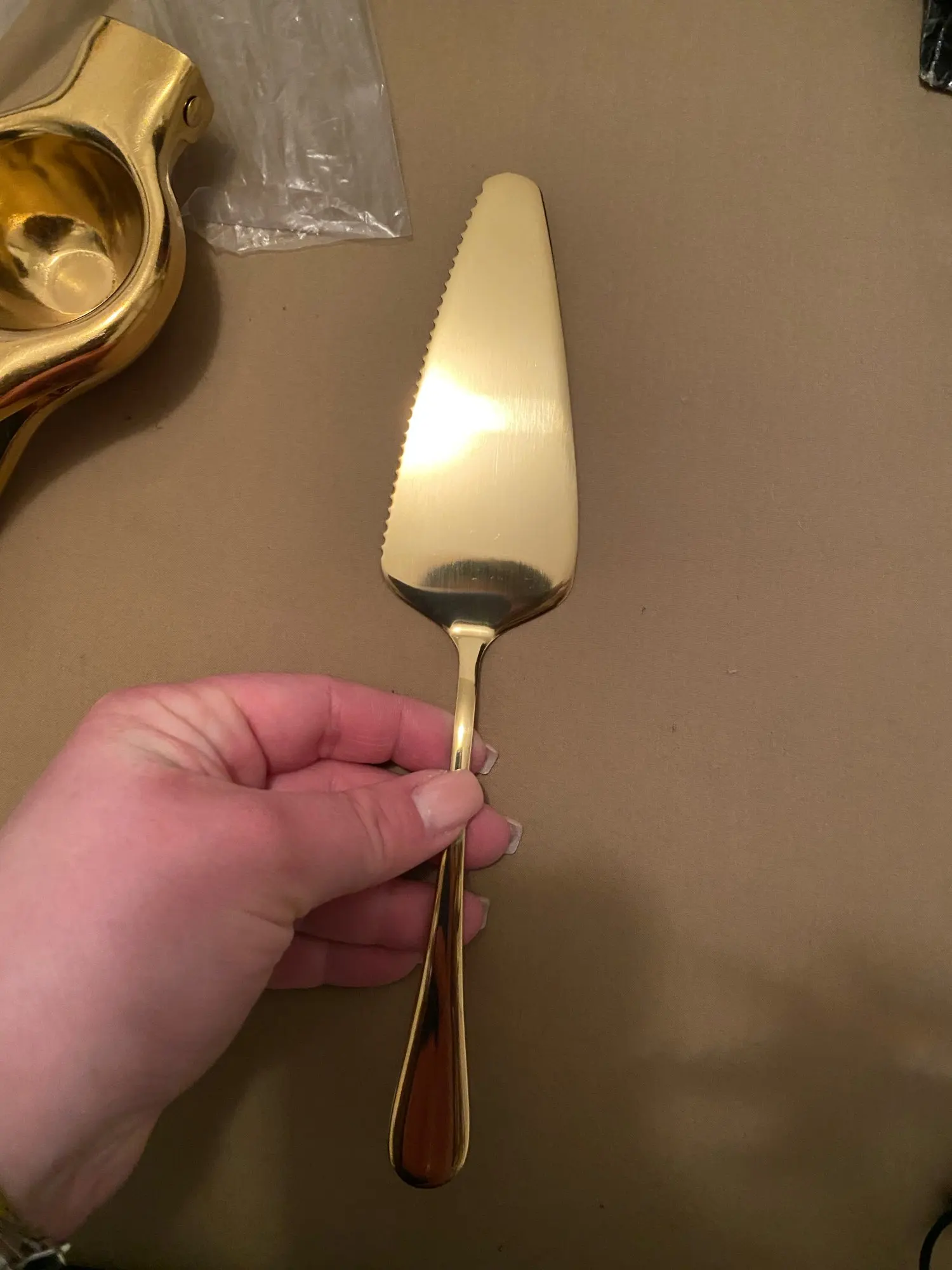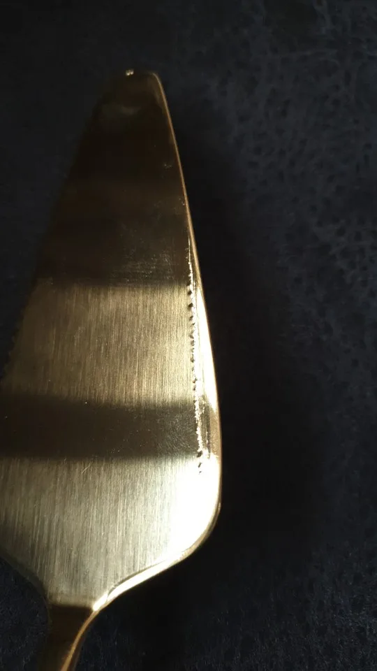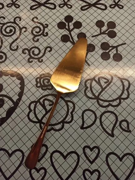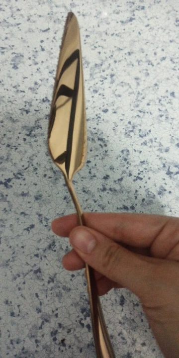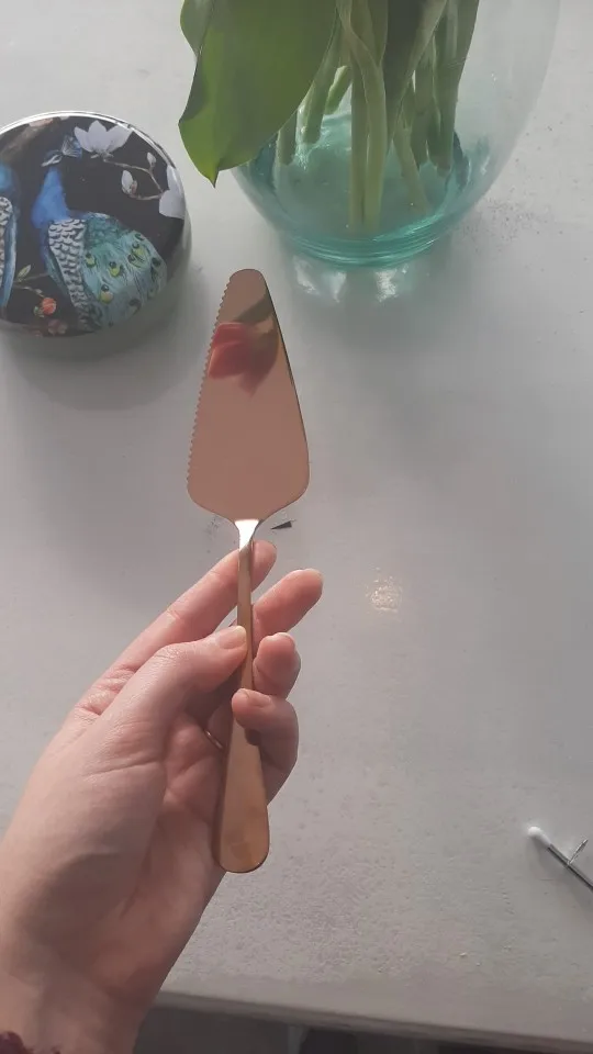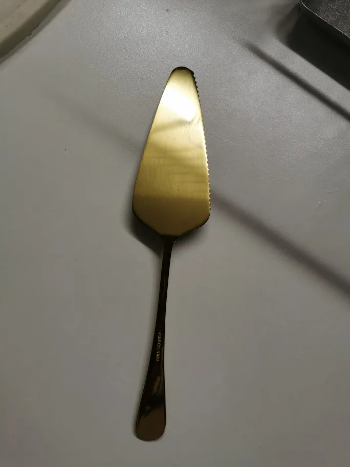 Очень красивый нержавеющий стальной золотой лопатой сервер ножей и разделитель для пирожных, пиццы, сыра... Это точно соответствует описанию, кажется, хорошее качество Товар был доставлен почтальоном с помощью метода доставки продавцом в Марокко Есть некоторые царапины, но это нормально Я рекомендую продавцу