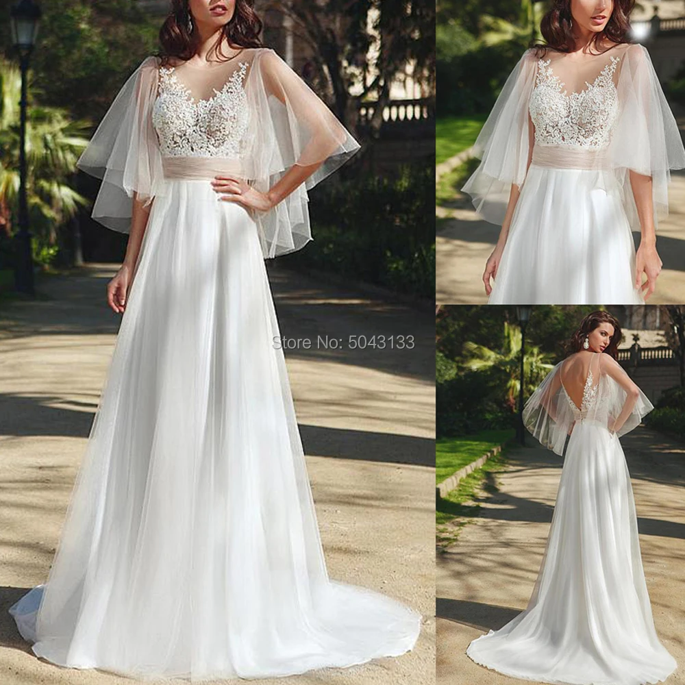Элегантные Свадебные платья из тюля в стиле бохо 2020, Кружевная аппликация, круглый вырез, рукав-фонарик, пикантное свадебное платье, открытая спина, длина до пола, платье невесты