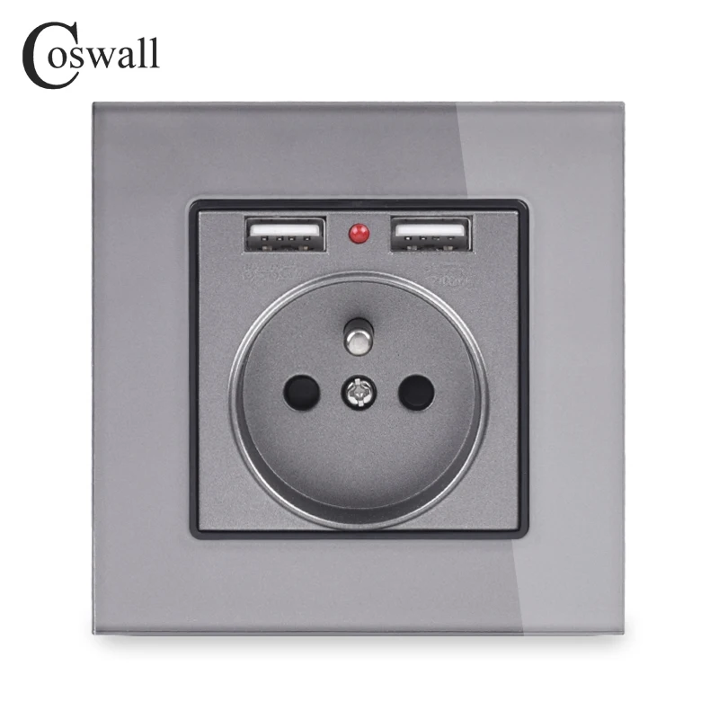COSWALL двойной USB-порт для зарядки 16 А настенная розетка для розетки во французском Польше стеклянная панель ПК матовый серый цвет