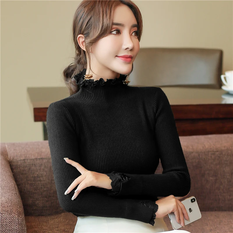 Женский Однотонный свитер с оборками, повседневный Пуловер зеленого и черного цвета с высоким воротником, 2021 50, 5050