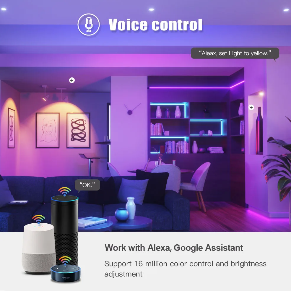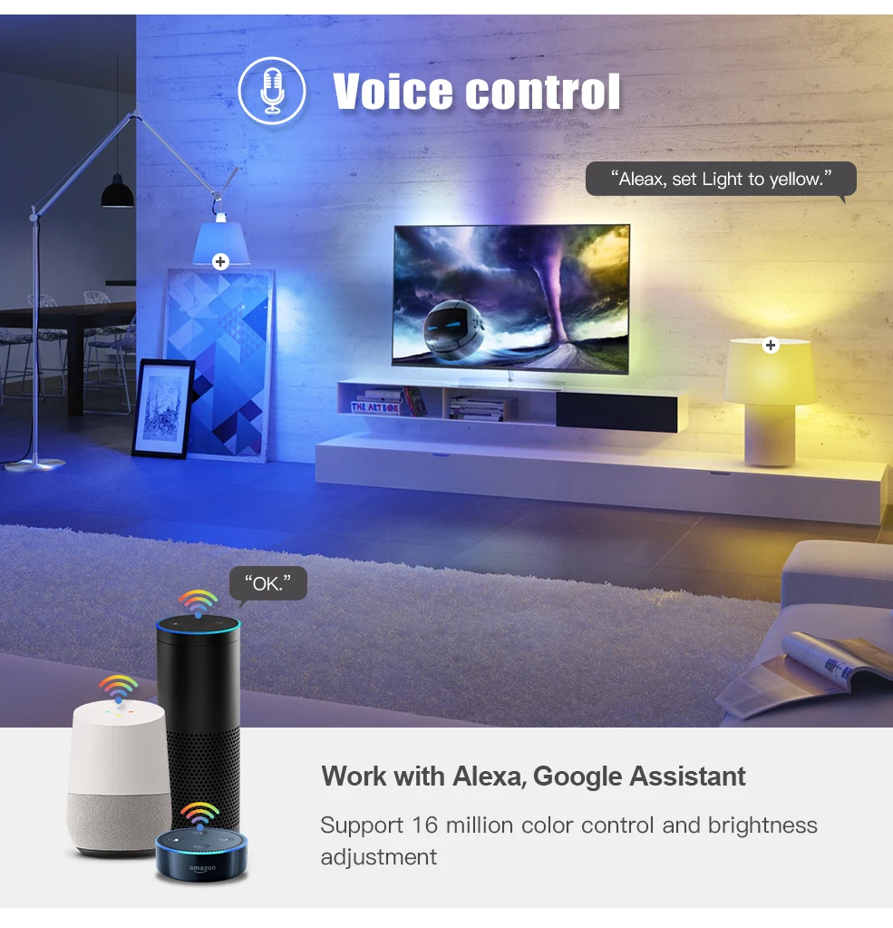 Совместимость с голосовым управлением: умная лампа работает с Alexa Echo, Google Home Assistant, вы можете управлять умной лампой через свой голос, И просто нужно дать голосовую команду, чтобы включить/выключить или затемнить/осветить ваш светильник (Е. g. "Alexa, установите спальню на синий").Дистанционное управление с помощью приложения: включение/выключение Alexa, google home включило умную лампочку, будь то дома или за его пределами, вам просто нужно загрузить приложение «smart life». Вы можете создать группу для всех ваших умных ламп и управлять ими с помощью только одной команды.RGBCW и многоцветная умная лампа: RGB холодный белый и теплый белый смарт-лампа создает ваши любимые эффекты светильник с 16 миллионов цветов и яркость каждого цвета затемнения.Широкое применение и сцена системы: вы можете установить различные режимы светильник на умной жизни, чтобы соответствовать различным случаям, включая кухню, гостиную, спальню. Также используется для настольной лампы, кафе, бара, вечерние и т. Д. И имеет эту цветовую палитру функций, управление группой,