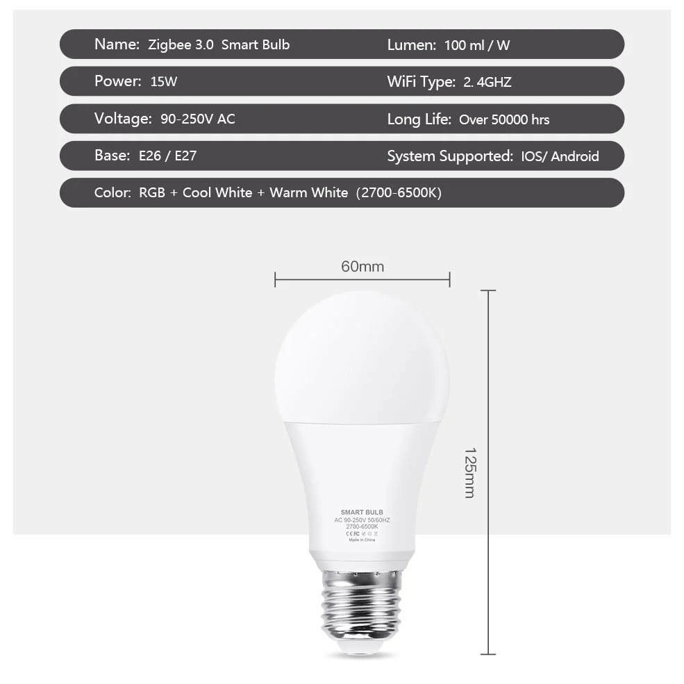 Тип: смарт-светодиодный светильник Zigbee 3,0Материал: авиационный алюминий, пластикТип гнезда: E26/E27Мощность: 15 ВтНапряжение: 90-250 В переменного токаЛюмен: 100 лм/ВтСрок службы: >50000 чЗагрузка приложения: Smart LifeСтандарт беспроводной связи: Zigbee 3,0Светильник цвет: RGB + теплый белый + белый (2700K-6500K)Функция: Голосовое управление, дистанционное управление с помощью приложения, регулировка яркости, поддержка Phi * lips H * ue,Tuya,Smart * things Amazon Alexa Echo,Google Home Assistant