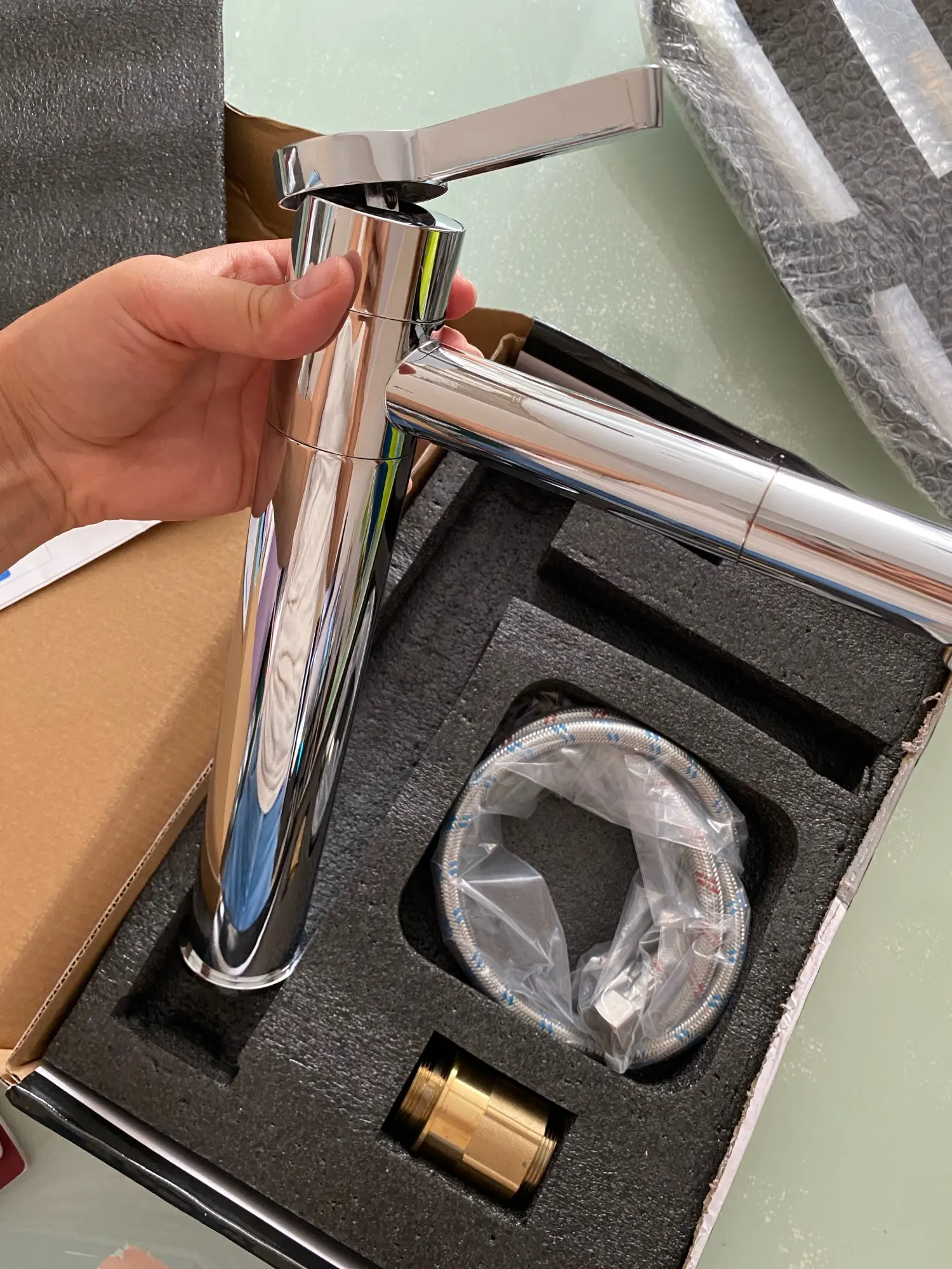 Выглядит прямо как на картинке. Заказывала хром. Посылка пришла быстро. Но скажу честно, что кран за 50 евро можно было бы упаковать чуточку лучше. Ручка плавная, сам кран довольно увесистый прочный. В быту ещё не пробовали, как поставим и попользуемся, дополню отзыв. В комплекте была инструкция, так же два подвода под холодную и горячую воду на 60см, крепление к столешнице+две прокладки к этому креплению и сам кран.