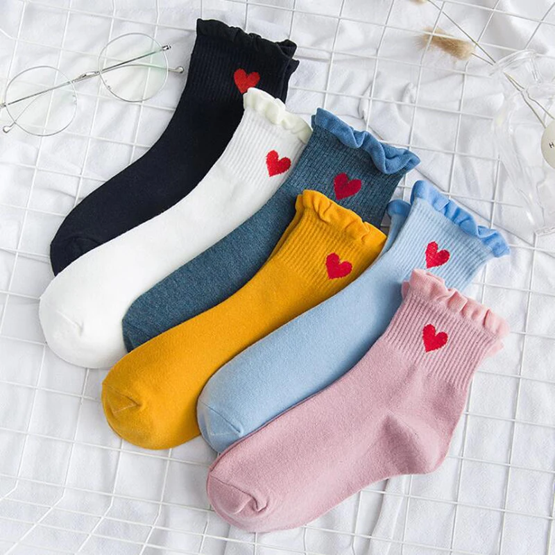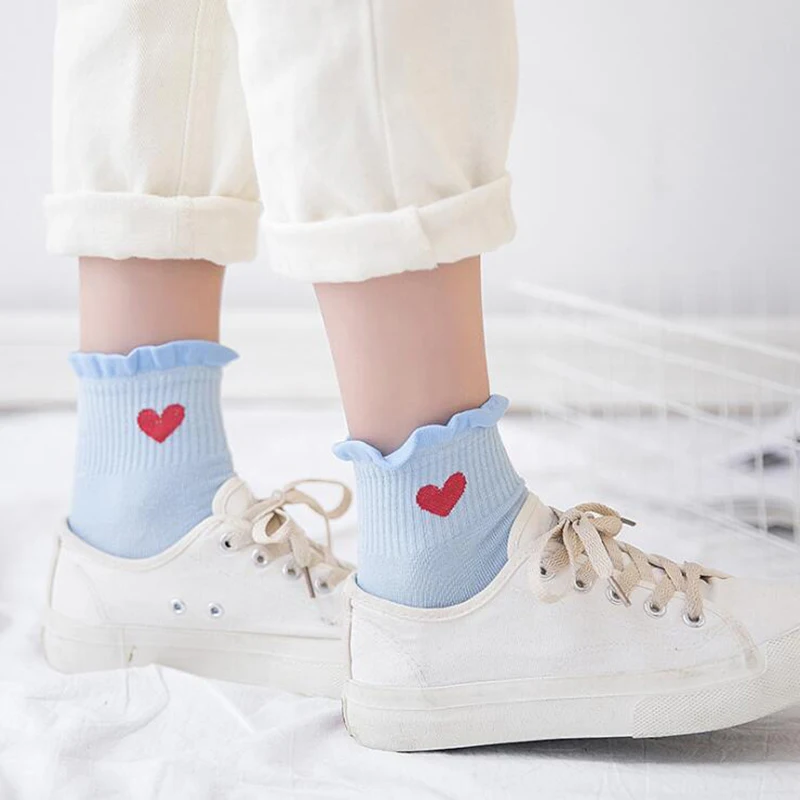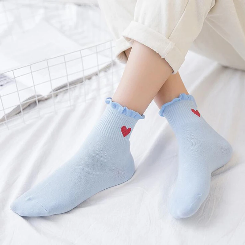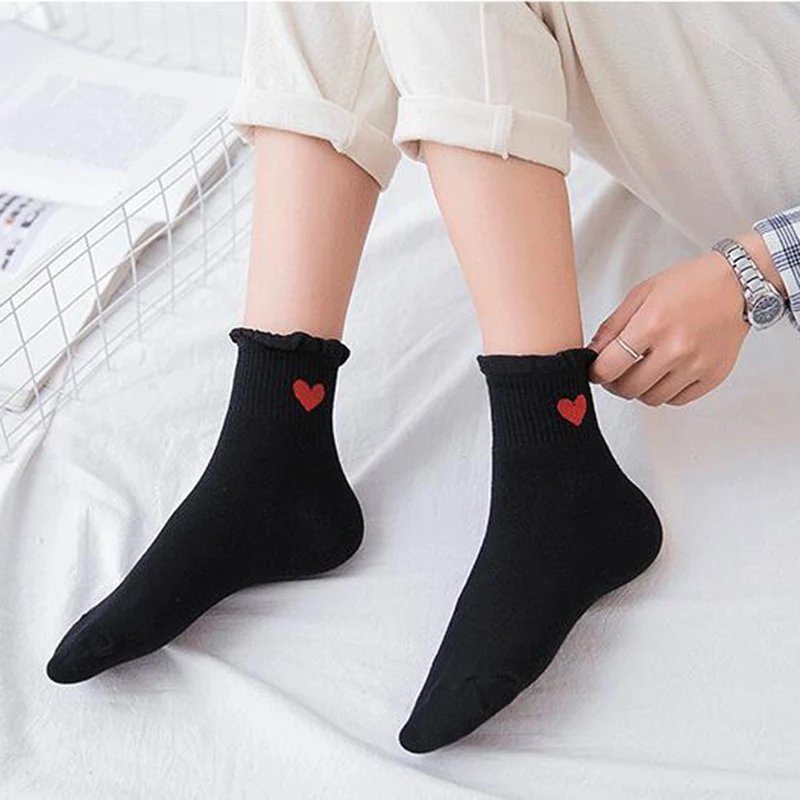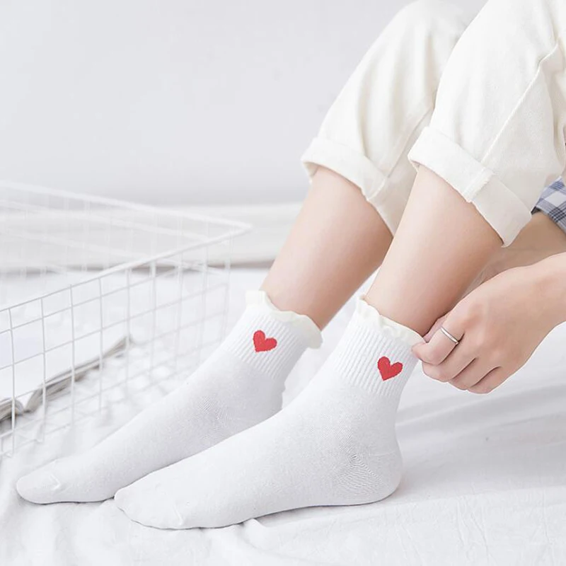 Harajukuвышитые носки с принтом в форме сердца, женские милые хлопковые носки с рюшами, забавные носки до щиколотки, носки в Корейском стиле для девочек, Mujer