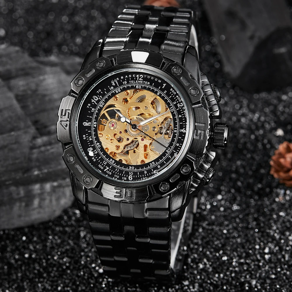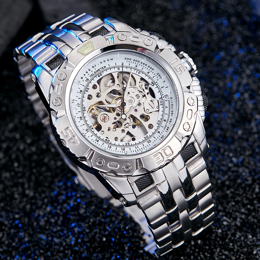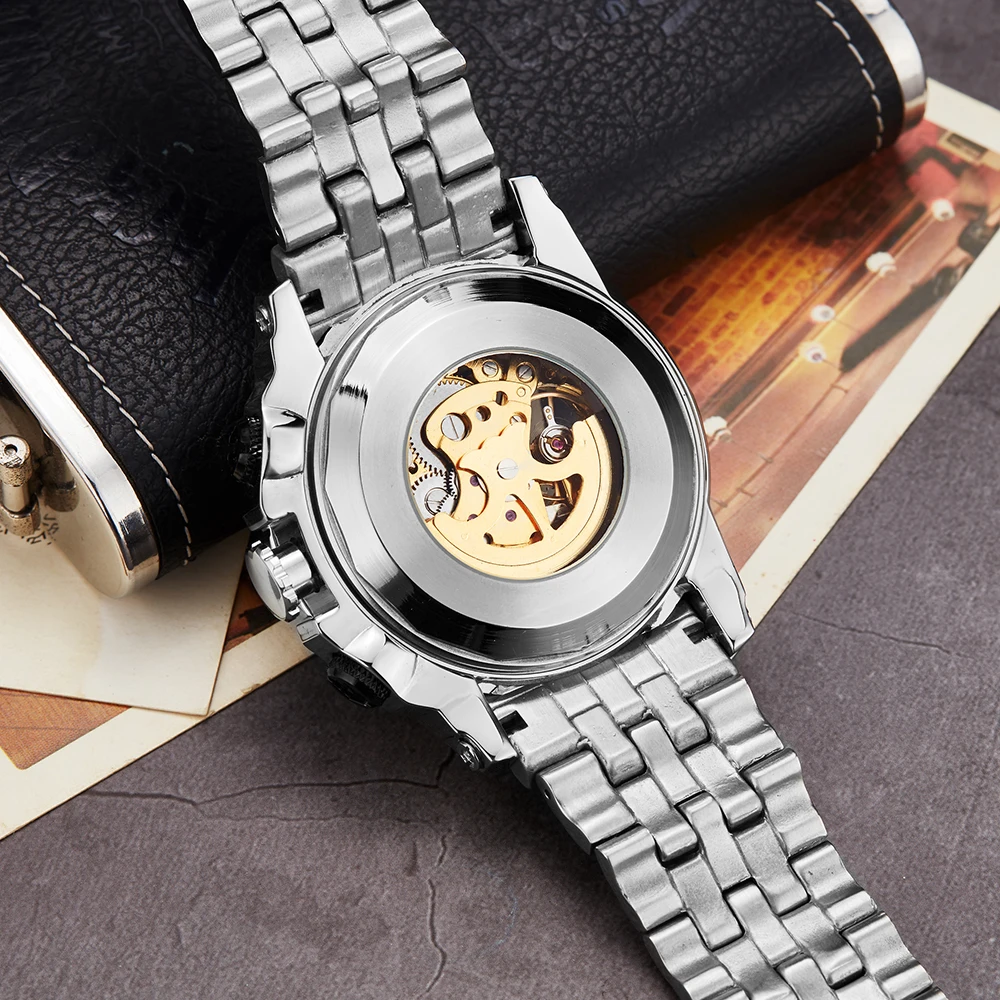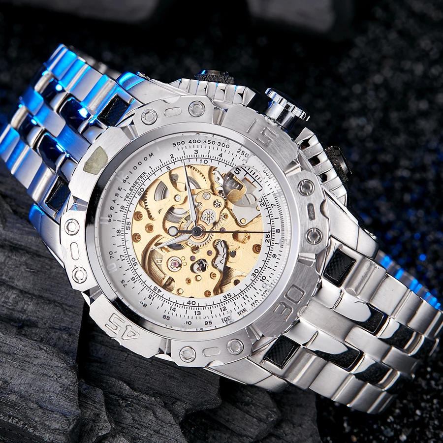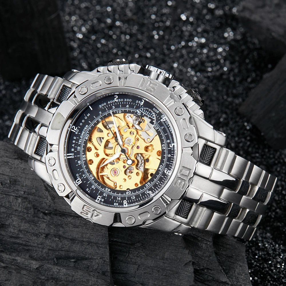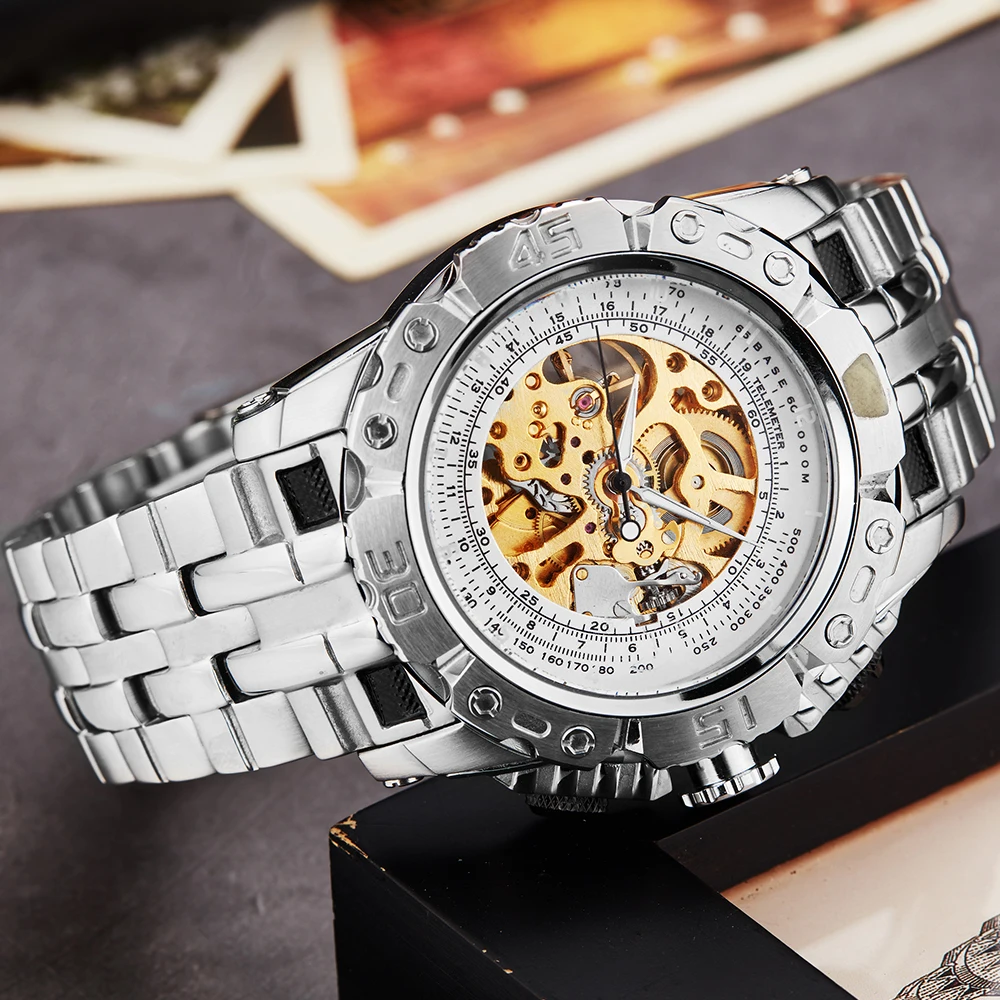 Часы-скелетоны Мужские механические, серебристо-Золотистые, автоматические, с большим циферблатом