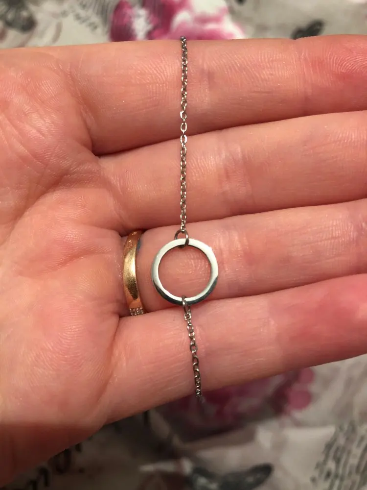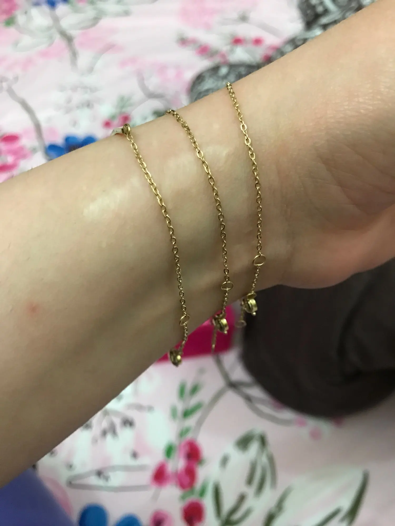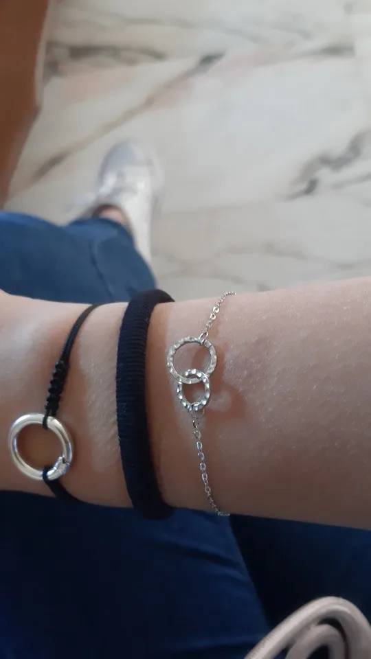 Выглядит так же, как на фото. Браслет изящный и простой. Мне нравится! Есть 3 размера/застежки кольца.