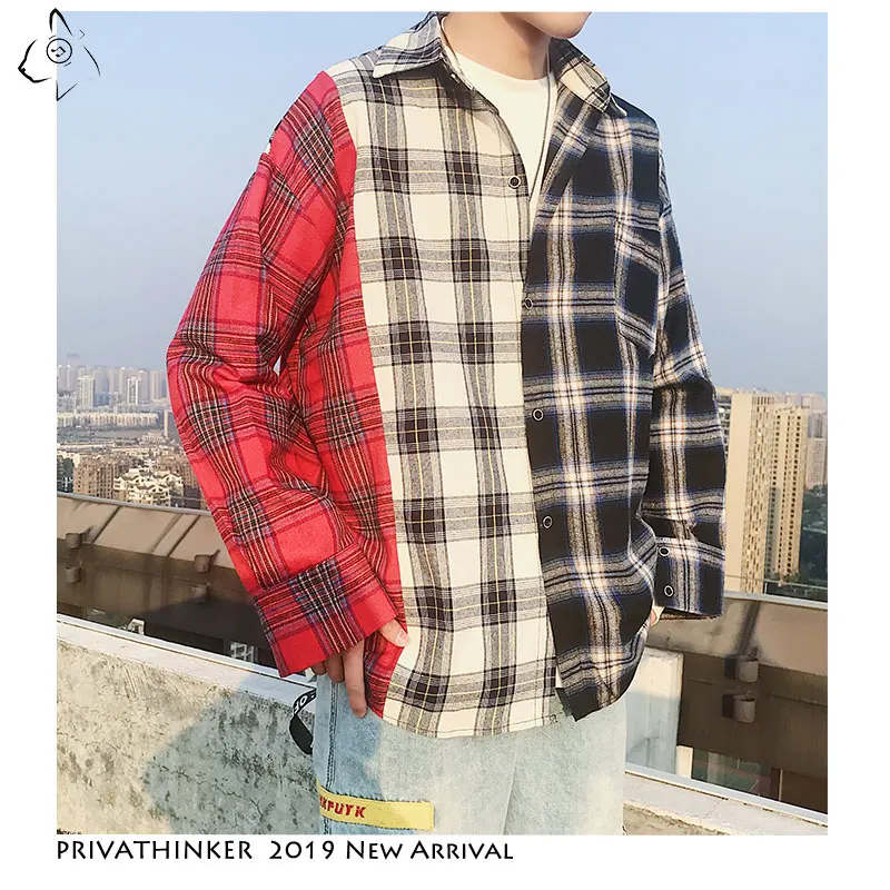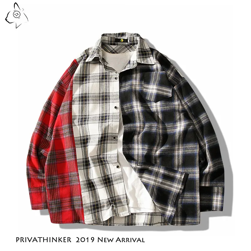 Privathinker Мужская Трехцветная рубашка 2020 Мужская s Японская уличная одежда Повседневная рубашка Лоскутная клетчатая рубашка плюс размер осень