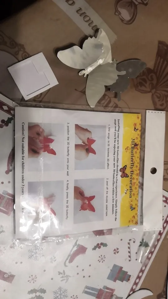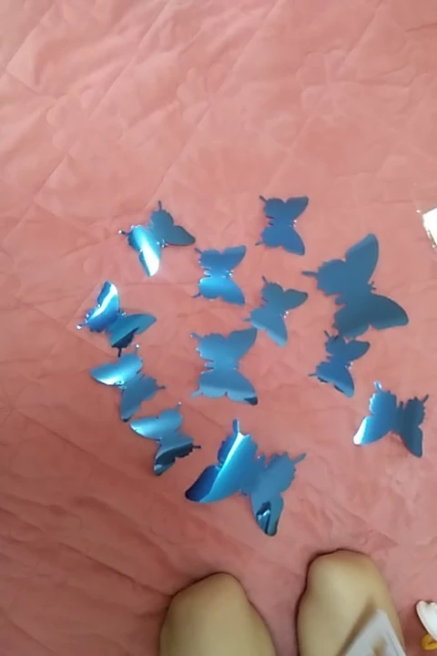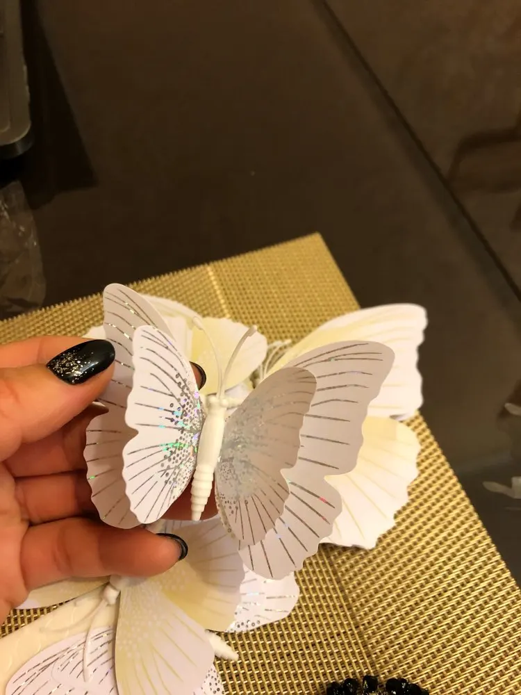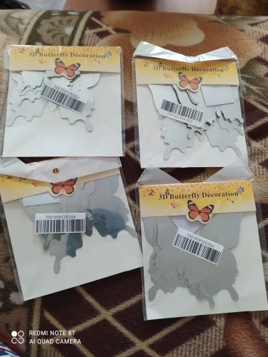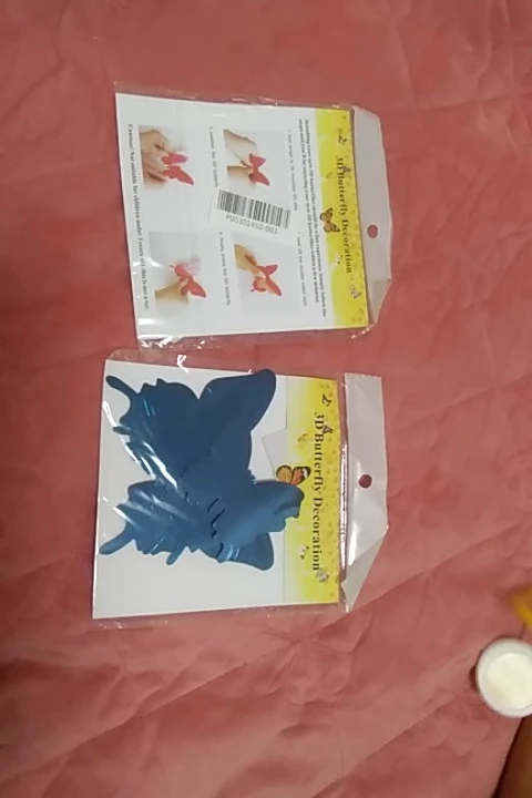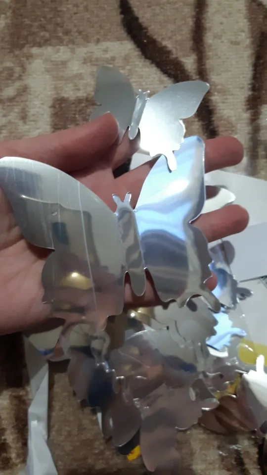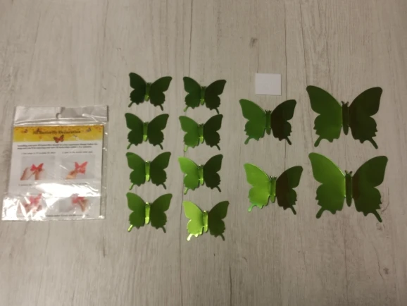 доставка быстрая, упаковка хорошая. пришло 5 упаковок, в каждой по 7 двойных бабочек, одинаковые со всех сторон. вложег скотчик двусторонний для наклейки. спасибо продавцу за количество бабочек!
