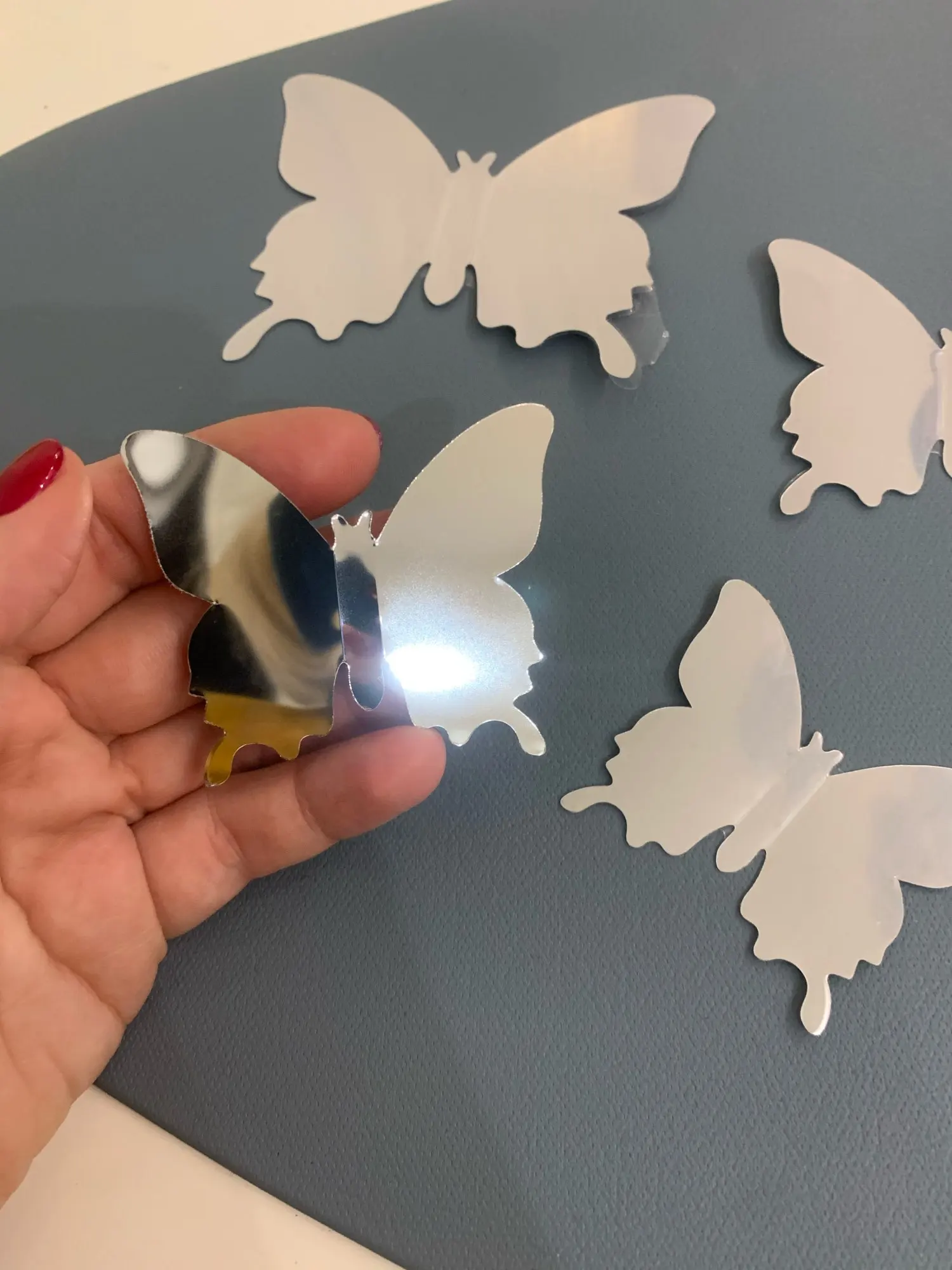 Великолепные зеркальные бабочки! В прекрасном состоянии без царапин и сколов. Плёнка снимается с двух сторон и довольно легко, в отличие от некоторых других похожих товаров. Клеится и ппреклеивается тоже отлично! Доставка примерно 3 недели.