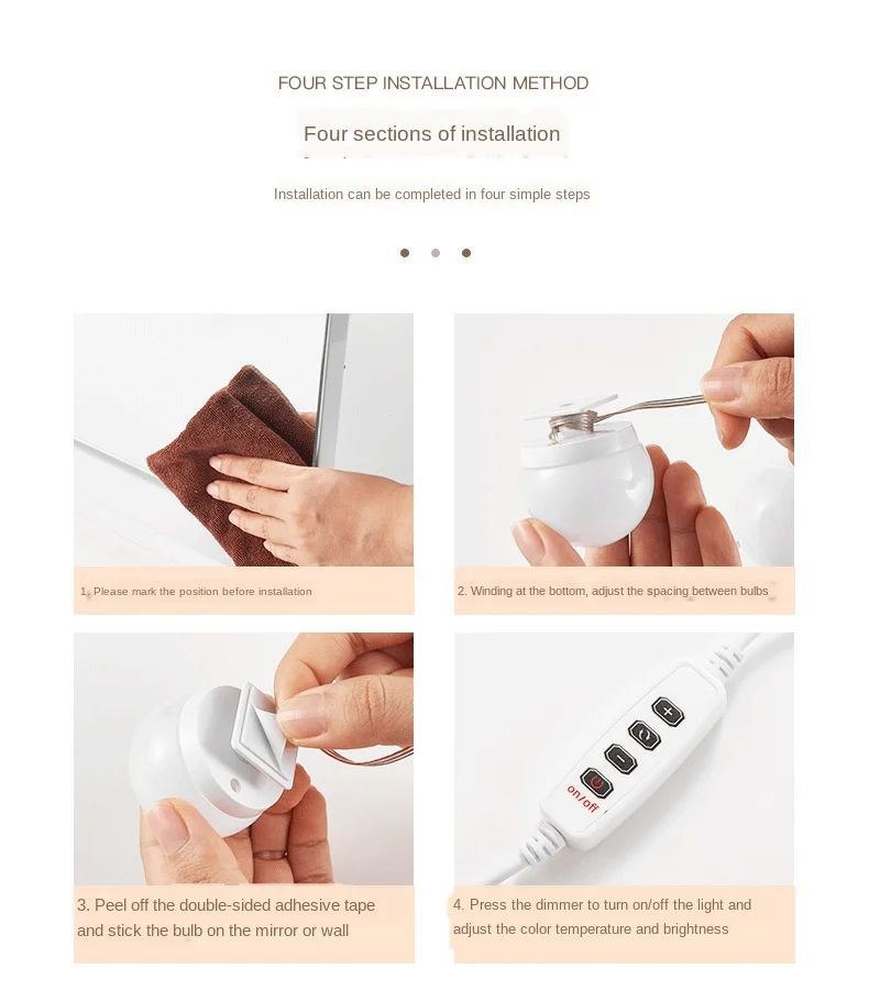 О товаре Четырехъядерный светильник-обеспечивает естественное освещение Беспроводные-устанавливается за считанные секунды с помощью прилагаемых присосок, никаких инструментов или проводов не требуется Портативный дизайн-снимите его с зеркала и в дороге, легко помещается в чемодан или вещевой мешок Ненагревающиеся лампочки-прослужить До 50000 часов, требуются 4 батарейки типа АА-в комплект не входит Сливается для бесшовного вида в вашей ванной или спальне. Прекрасный подарок для мам, бабушек, сестер, дочерей, друзей и подружек невесты