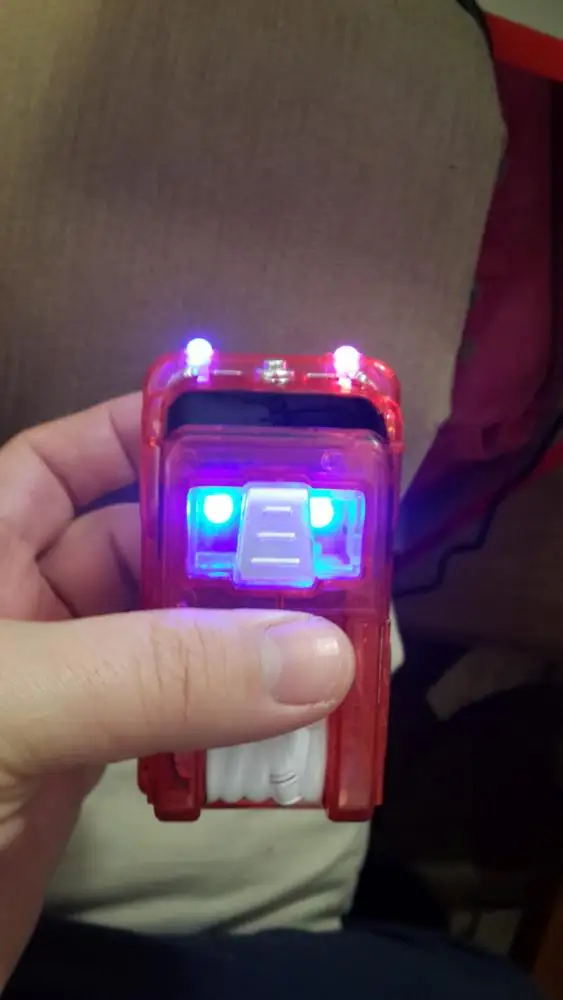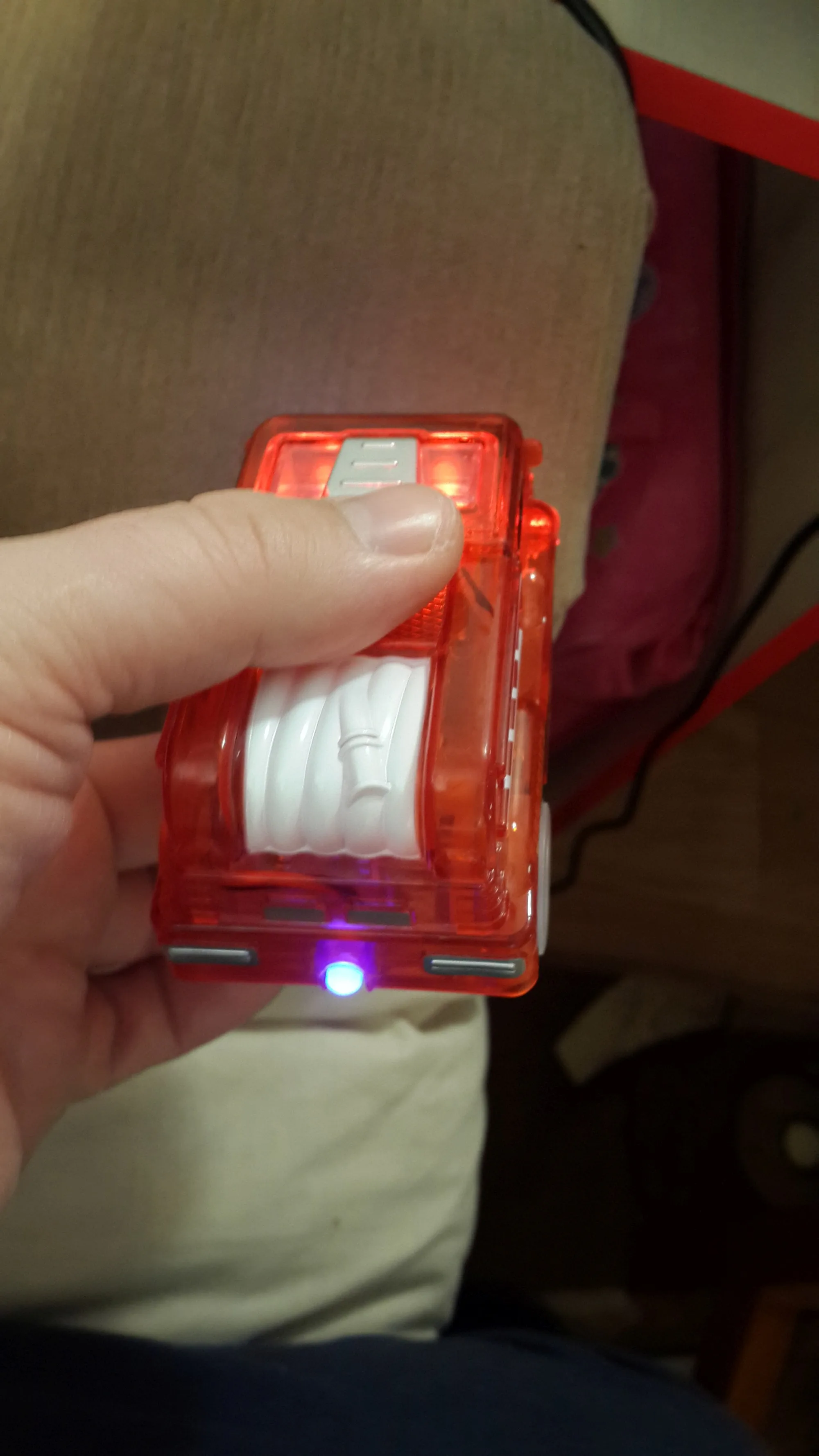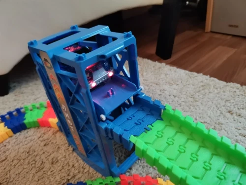 более приплюснут чем на картинки, но это к лучшему. подходит к лифту от трека 1toys. работает на двух пальчиковых батарейках. очень шустрый