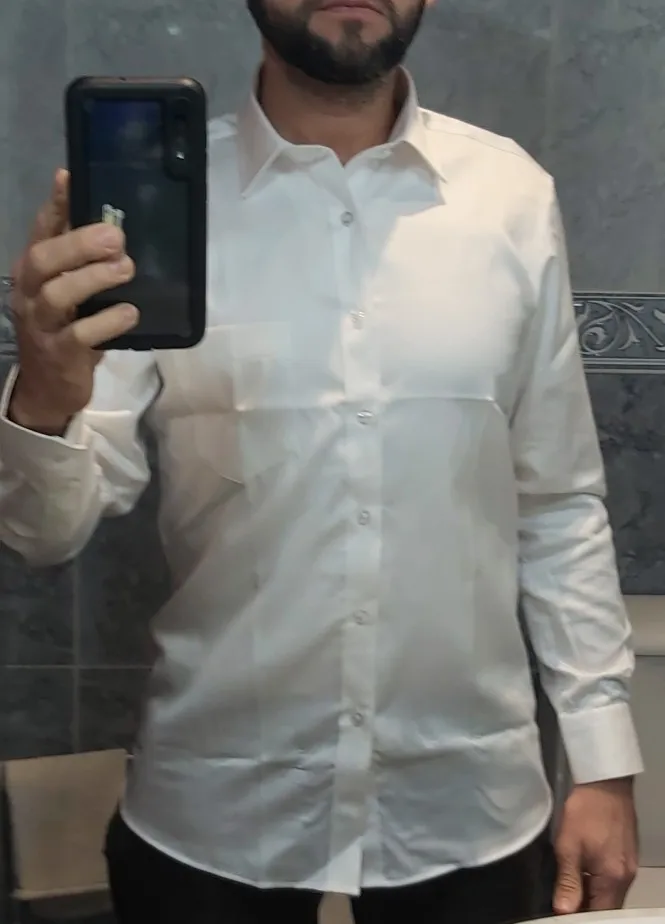Быстрая доставка менее чем за неделю -Ткань качественная и мягкая текстура и немного блестит -В части багажника он очень хорошо сидит -Жесткая Шея -Твердые рукава Примечание: выберите правильный размер, а белый более непрозрачный, чем Оригинальное изображение. Я рекомендую это 100% Я собираюсь купить другую рубашку, но меньшего размера, чтобы она выглядела лучше, и я передам фотографии