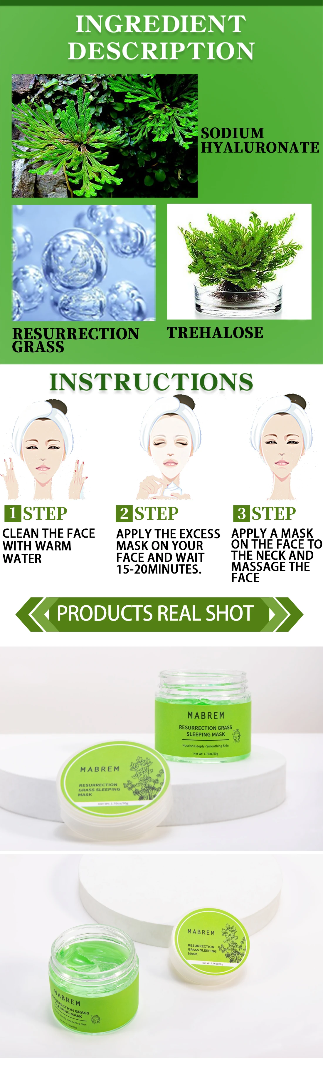 Полученный из экстракта травы воскресения, в сочетании с гиалуронатом натрия, он может обеспечить кожу двойным увлажнением и увлажнением, увлажнением и питанием сухой и обезвоженной кожи. Увлажняющая текстура может восстанавливать нижнюю часть кожи в ночное время, улучшает окружающую среду кожи и делает кожу пухлой, влажной, свежей и энергичной.