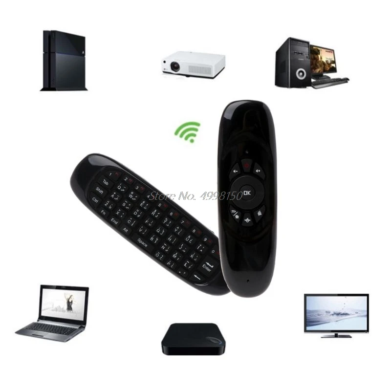 Это поддерживает беспроводную связь 2,4G, поэтому вам нужно подключить usb-адаптер air mouse, чтобы получить сигнал 10m. Можно использовать все клавиши клавиатуры.