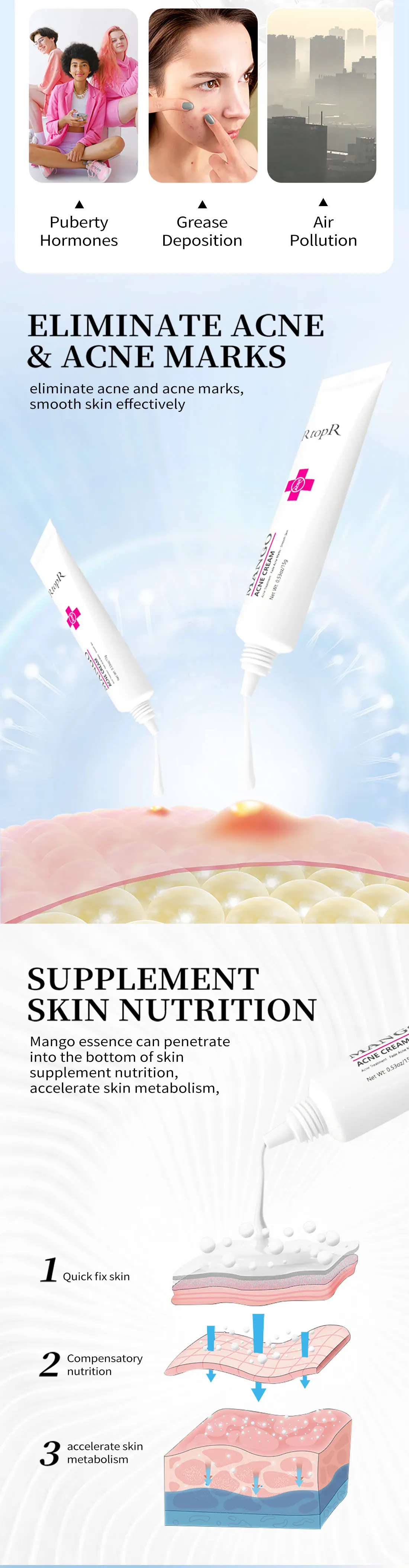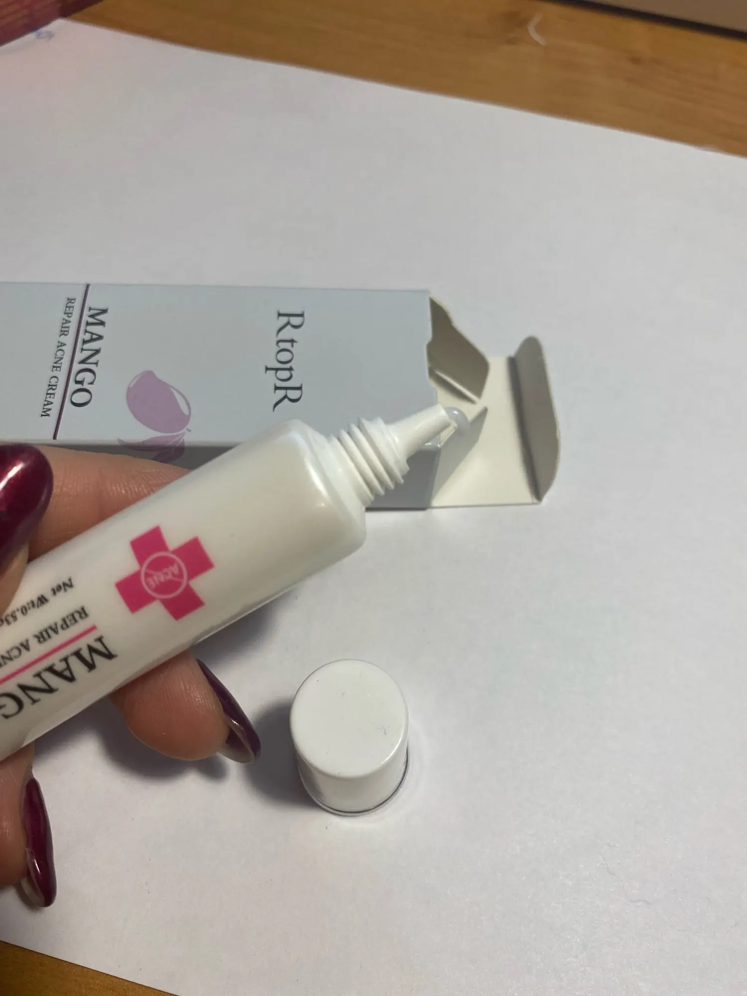 Доставка около месяца. Крем 15гр белого цвета, не жирный, быстро впитывается, с охлаждающим эффектом. Удобный носик позволяет наносить средство точечно. Крем снимает воспаление и подсушивает прыщик, ссужает поры и нормализуeт секреции желёз это помогает значительно быстрее с ними бороться. Часто бывают после больших прыщиков остаются шрамы, крем осветляет их и делает менее заметными.